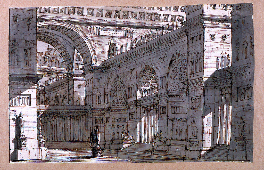Drawing, Stage Design, Palace Courtyard; Attributed to Angelo Toselli (ca. 1765? – 1826); Italy; pen and brown ink, brush and brown wash, black chalk on white laid paper laid down on light brown wove paper ; H x W: 25.1 × 39.2 cm (9 7/8 × 15 7/16 in.) H x W (Mat): 40.6 × 55.9 cm (16 × 22 in.); Museum purchase through gift of various donors and from Eleanor G. Hewitt Fund; 1938-88-418