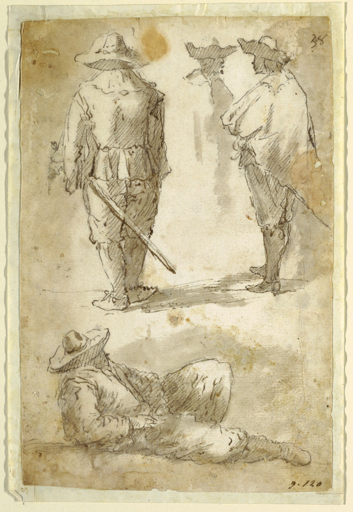 Drawing, Figural Studies of Soldiers; Attributed to Domenico Gargiulo; Italy; black chalk, pen and ink, brush and watercolor on paper; 19.6 × 13.3 cm (7 11/16 × 5 1/4 in.); Museum purchase through gift of various donors and from Eleanor G. Hewitt Fund; 1938-88-4431