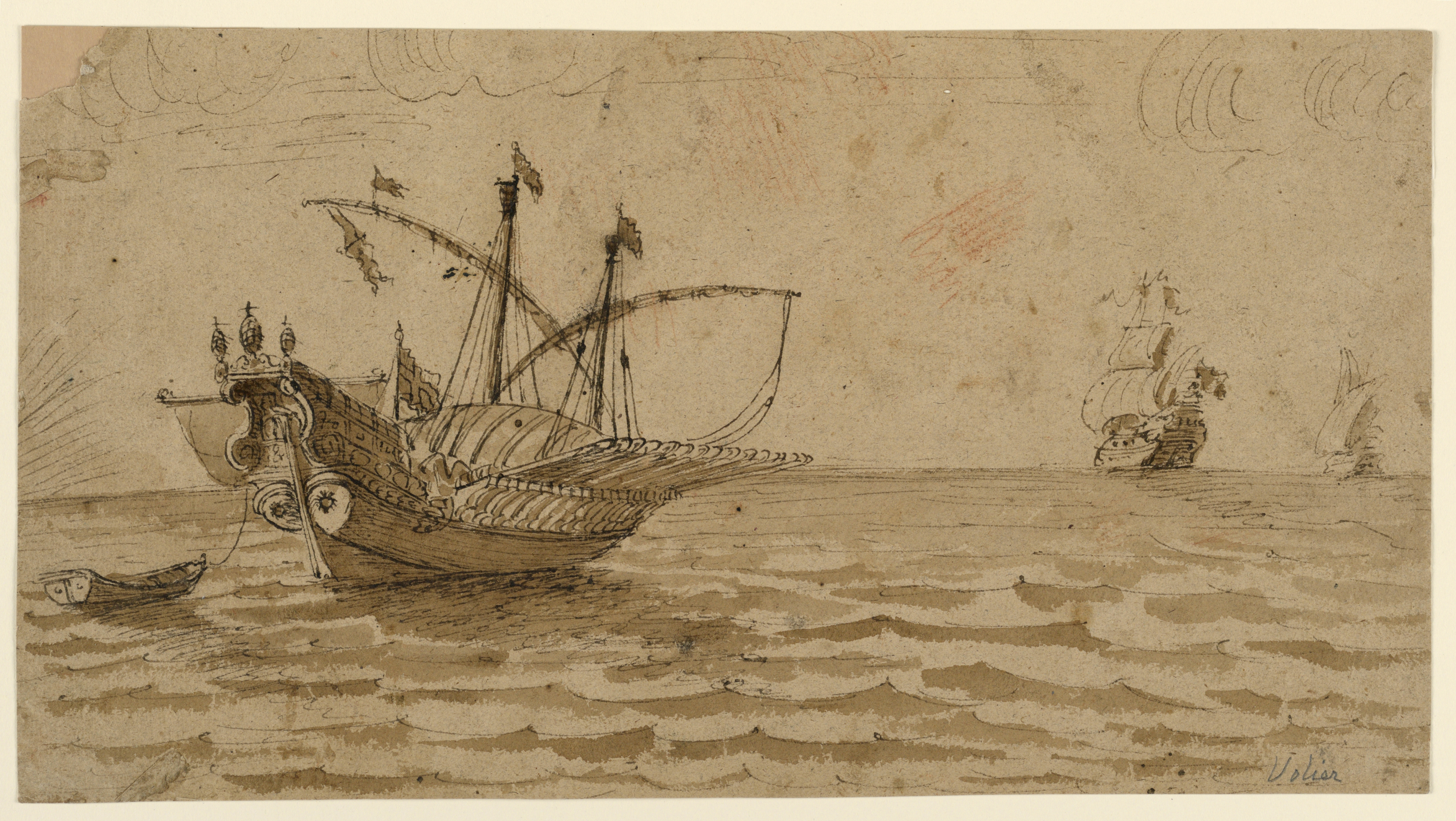 Drawing, Ships at Sea; Attributed to Pierre-Jacques Volaire; France; pen and ink, brush and wash on paper; H x W: 22.2 cm (8 3/4 in.); Museum purchase through gift of various donors and from Eleanor G. Hewitt Fund; 1938-88-4454
