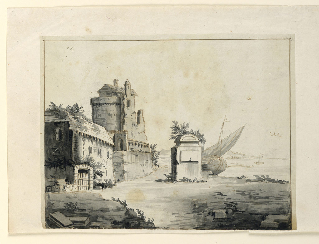 Drawing, Stage Design, Ruins Near Shore; Italy; pen and bistre ink, brush and sepia wash on paper; H x W: 17.4 × 22.8 cm (6 7/8 in. × 9 in.); Museum purchase through gift of various donors and from Eleanor G. Hewitt Fund; 1938-88-451