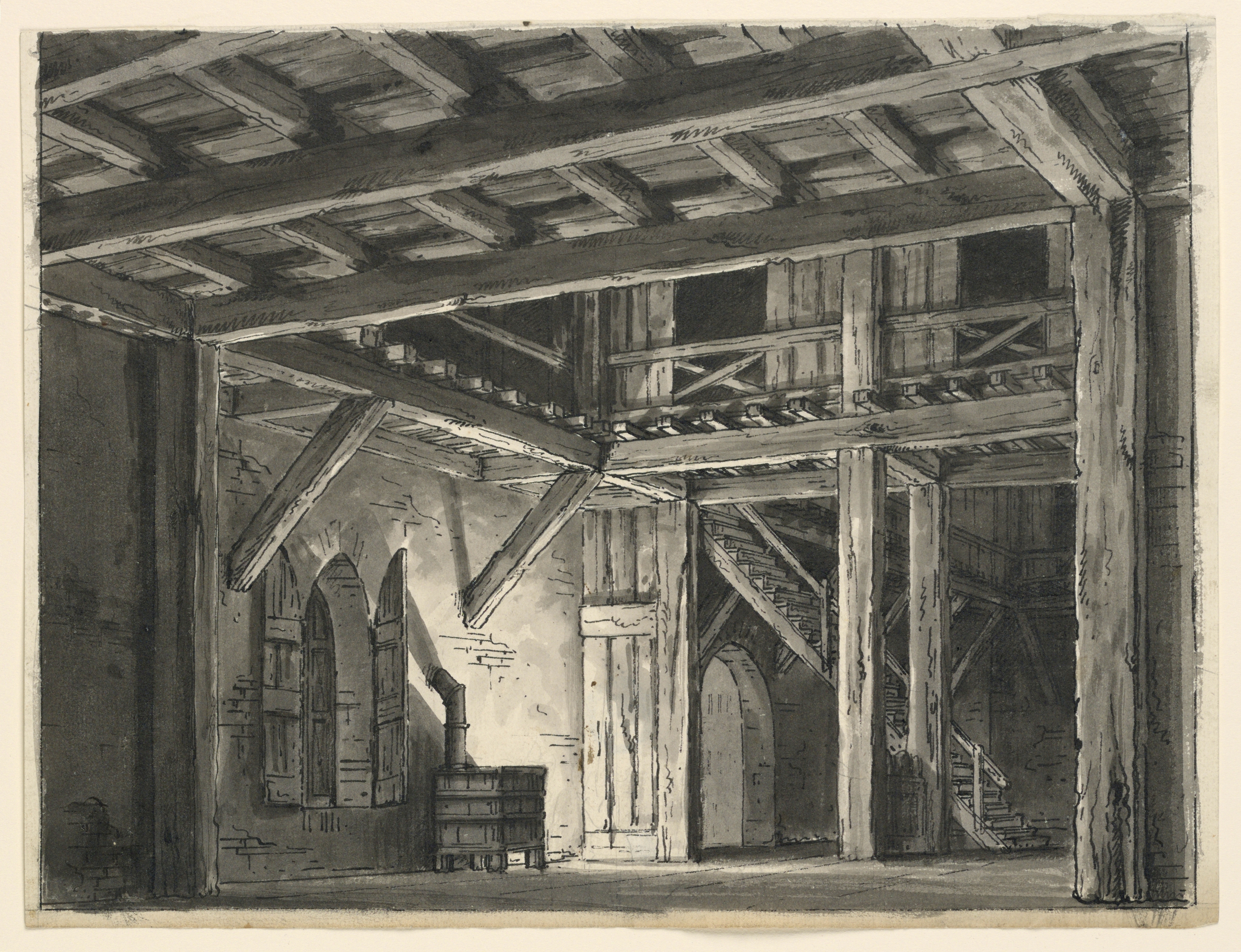 Drawing, Stage Design, Interior of Barn; Designed by Romolo Achille Liverani (Italian, 1809 - 1872); After Alessandro Sanquirico (Italian, 1777 - 1849); Italy; pen and sepia ink, brush and wash on paper; H x W: 20.8 × 27.5 cm (8 3/16 × 10 13/16 in.); Museum purchase through gift of various donors and from Eleanor G. Hewitt Fund; 1938-88-456