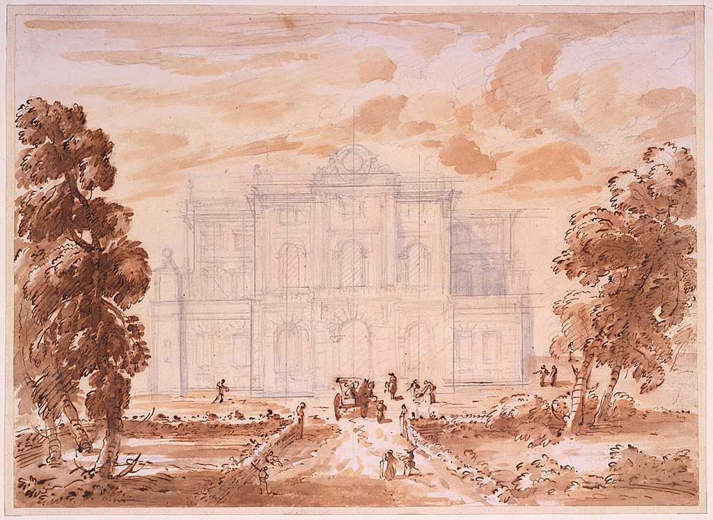 Drawing, Carriage Approaching Villa; Designed by Carlo Marchionni (Italian, 1702–1786); Italy; pen and brown ink, brush and brown, gray washes, graphite on off-white laid paper; H x W: 20.8 × 28.5 cm (8 3/16 × 11 1/4 in.); Museum purchase through gift of various donors and from Eleanor G. Hewitt Fund; 1938-88-487