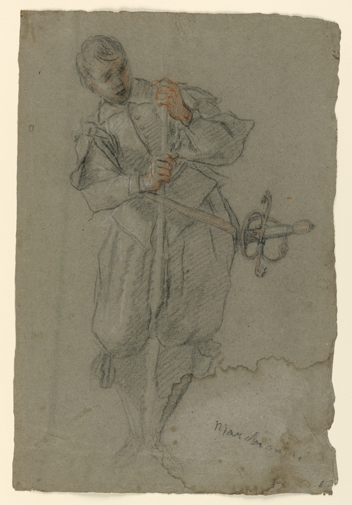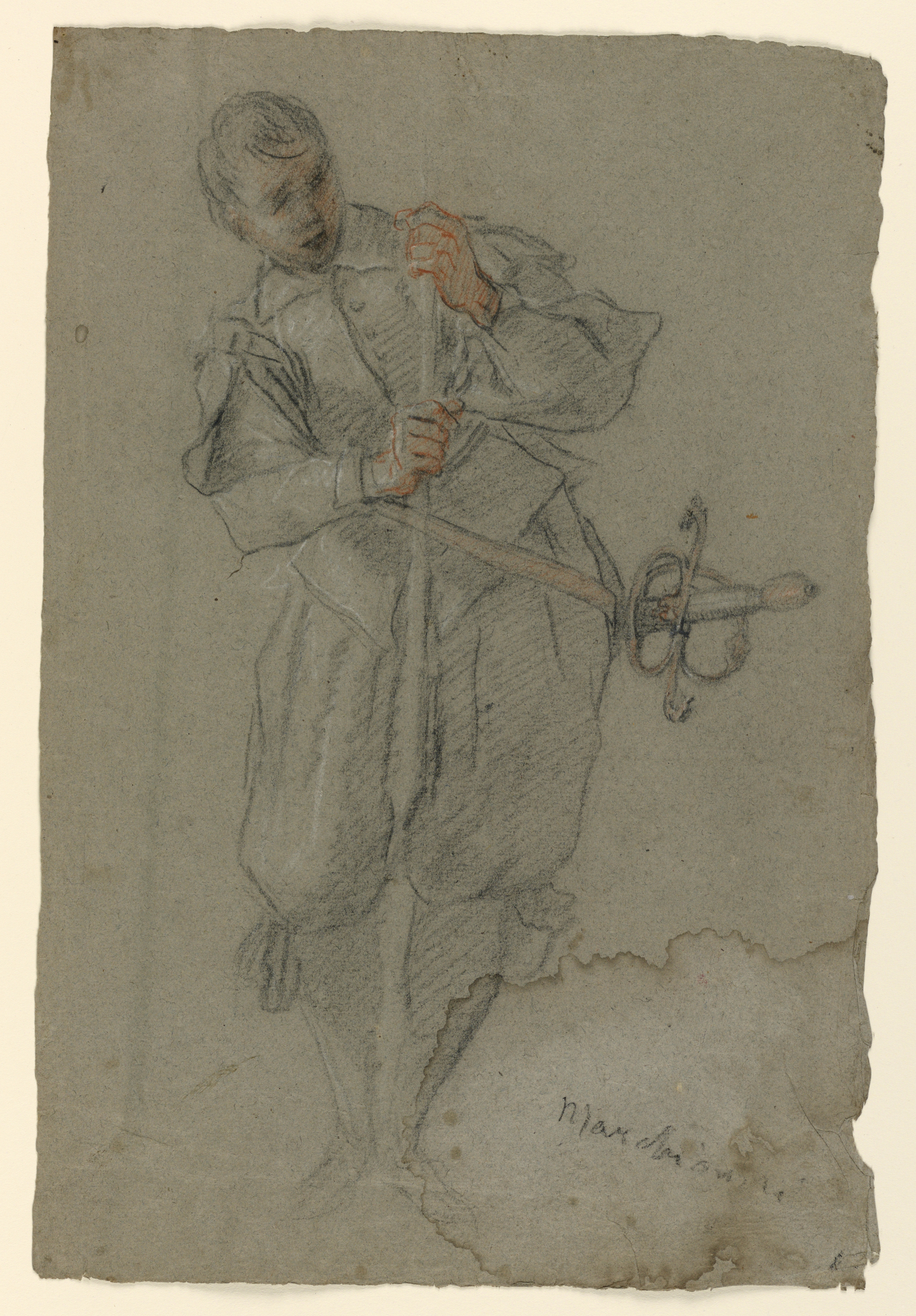 Drawing, Soldier Loading His Gun; Possibly by Carlo Marchionni (Italian, 1702–1786); Italy; black and red crayon on gray laid paper; 28.5 x 42.8 cm (11 1/4 x 16 7/8 in.); Museum purchase through gift of various donors and from Eleanor G. Hewitt Fund; 1938-88-490