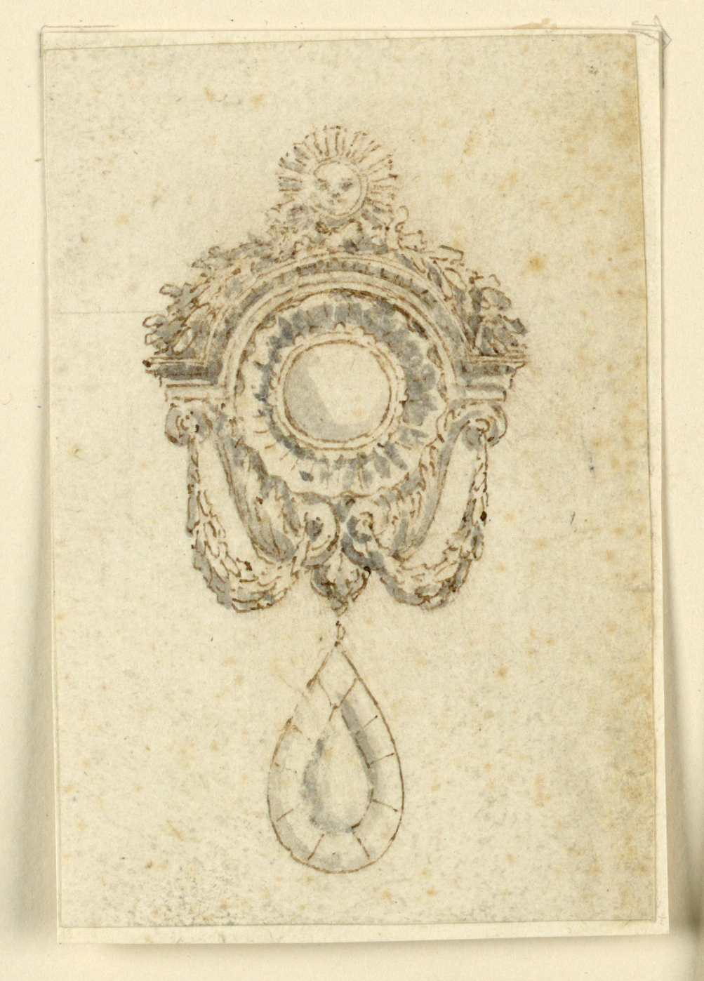 Drawing, Design for brooch with hanging drop and sun face; Italy; Museum purchase through gift of various donors and from Eleanor G. Hewitt Fund; 1938-88-5469