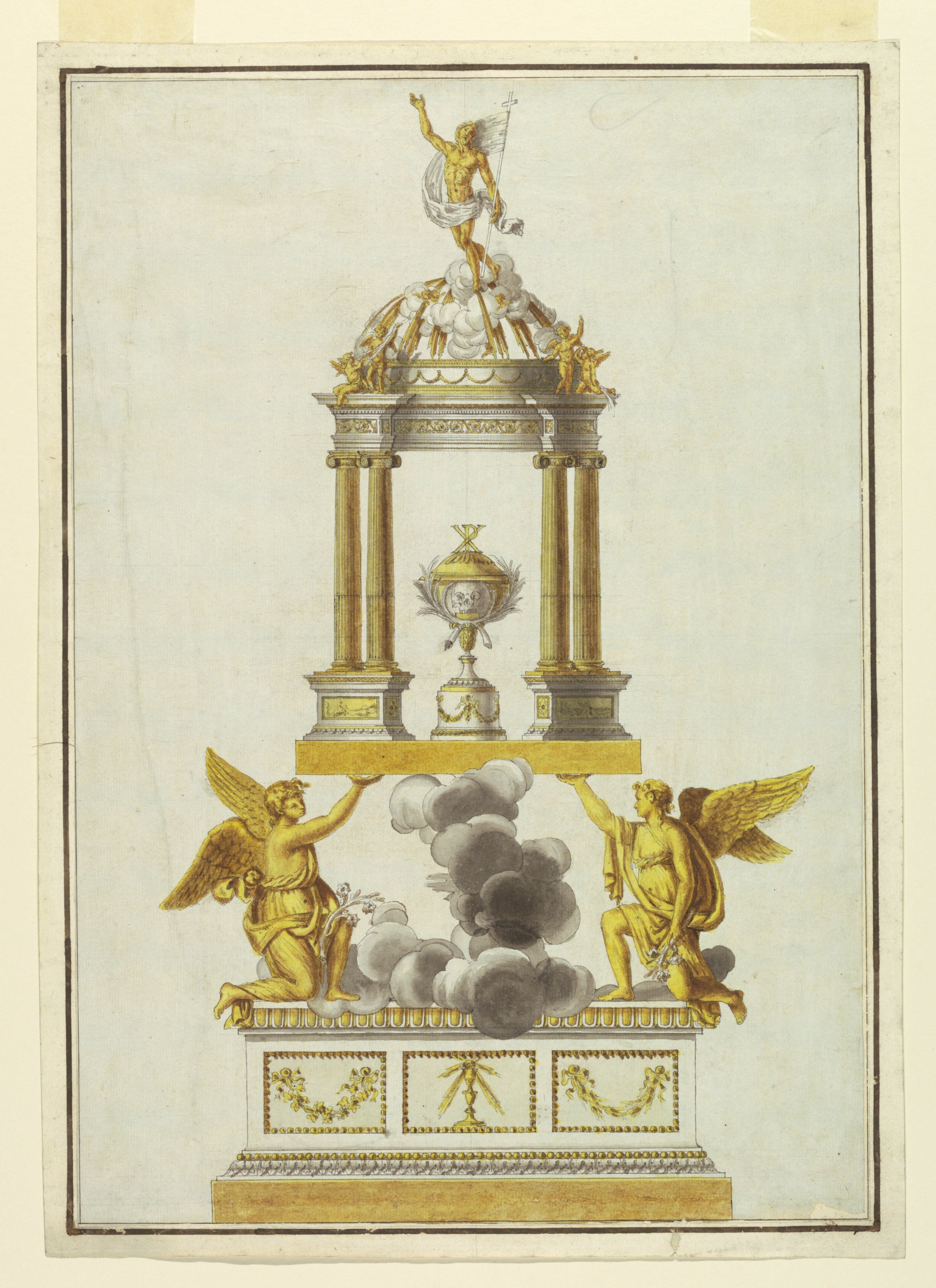 Drawing, Reliquary in White Marble and Gilded Bronze; Designed by Luigi Righetti (Italian, 1780 - 1819); Italy; pen and black ink, brush and watercolor, graphite, ruled border in pen and brown ink on light blue laid paper, laid down on white paper ; 46.2 × 34.5 cm (18 3/16 × 13 9/16 in.); Museum purchase through gift of various donors and from Eleanor G. Hewitt Fund; 1938-88-607