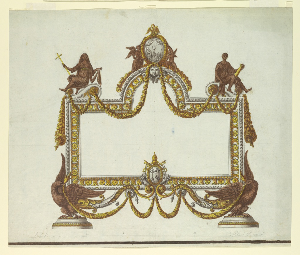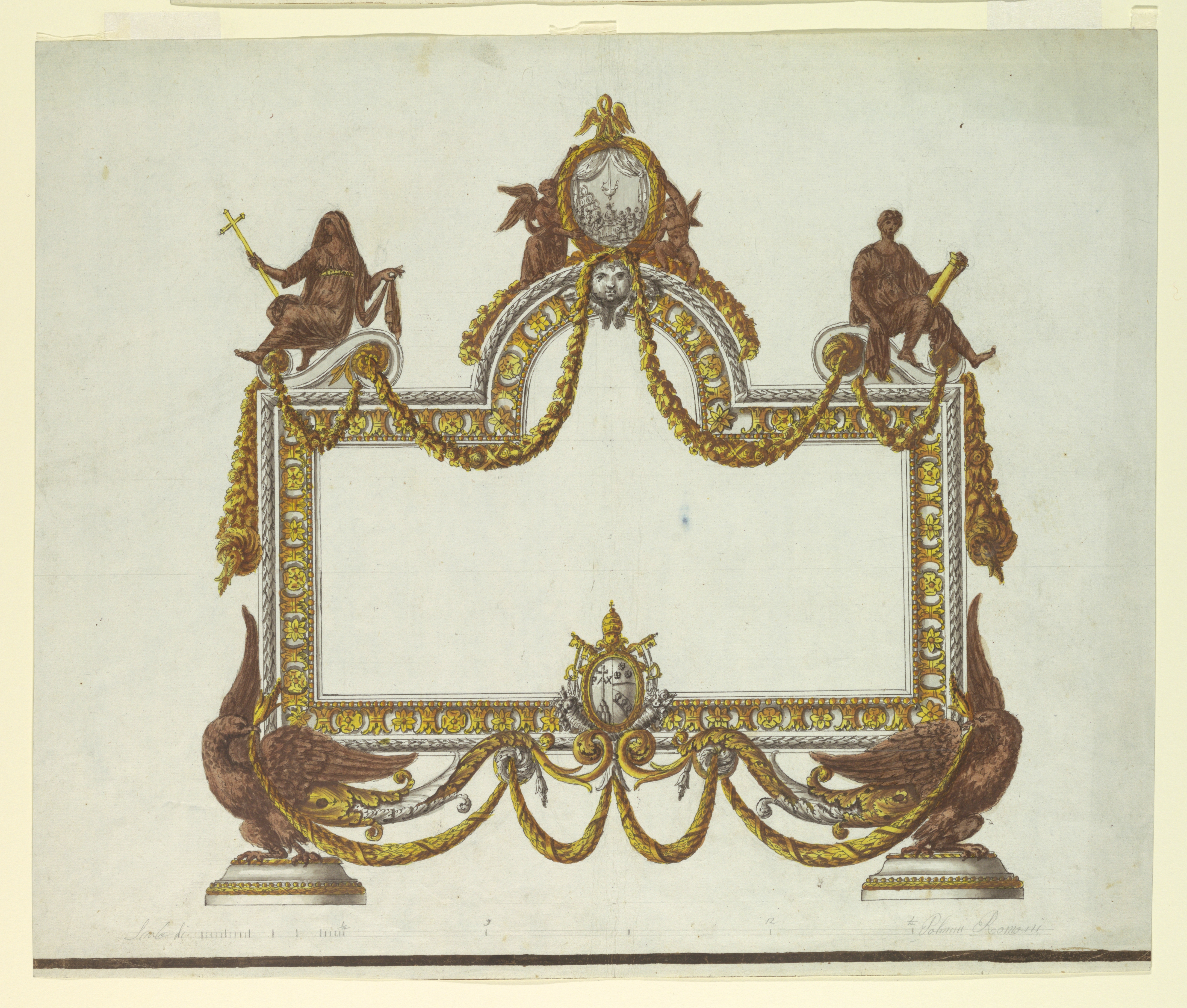 This is a Drawing. It was designed by Luigi Righetti and made for (as the client) Pope Pius VII. It is dated ca. 1820 and we acquired it in 1938. Its medium is pen and black ink, brush and gray, brown, yellow wash, over graphite, ruled border in brush and black ink on light blue laid paper. It is a part of the Drawings, Prints, and Graphic Design department.