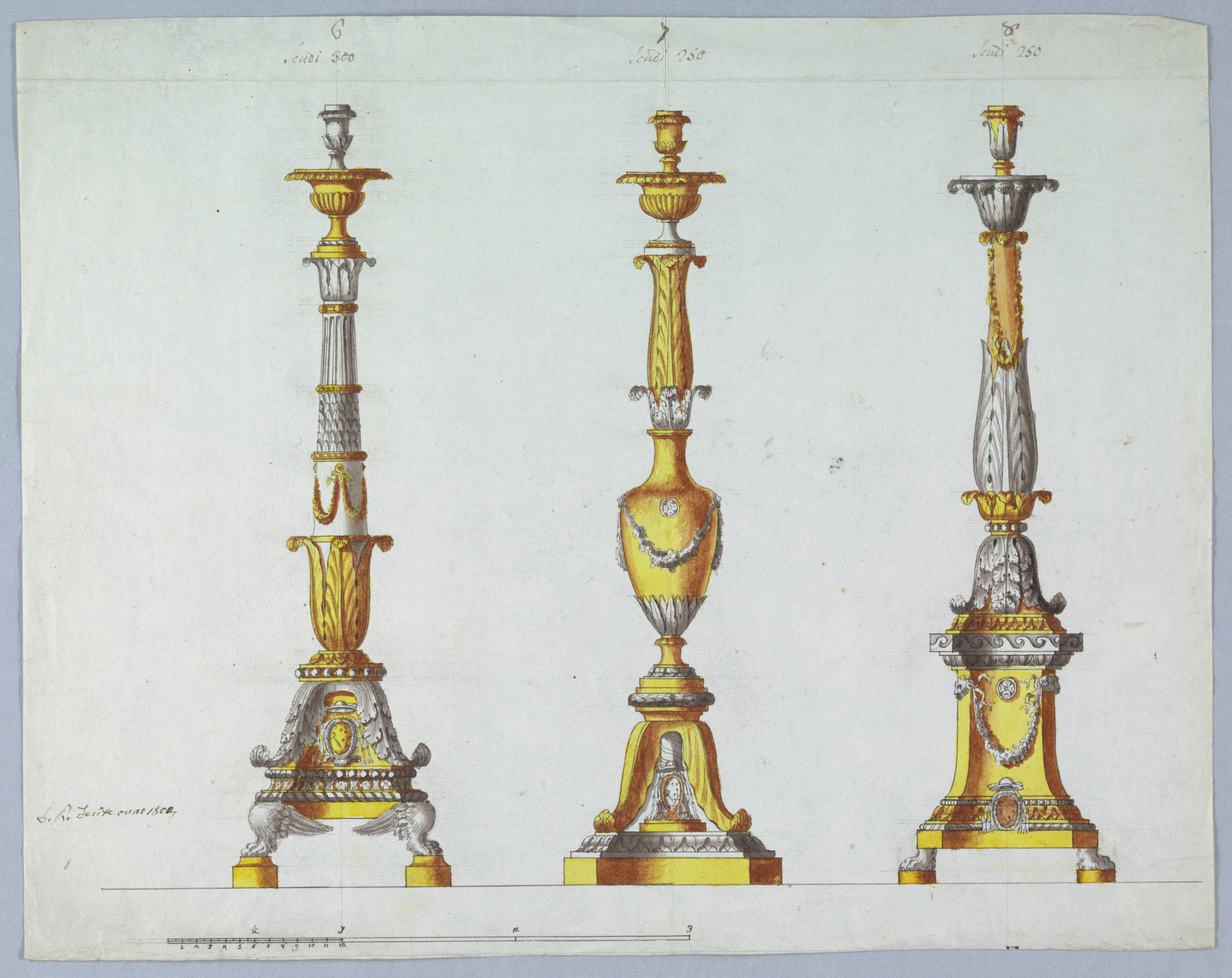 Drawing, Three Designs for Candlesticks; Designed by Luigi Righetti (Italian, 1780 - 1819); Italy; pen and ink, brush and sepia wash, gray, yellow watercolor, graphite on light blue paper; 34 × 42.9 cm (13 3/8 × 16 7/8 in.); Museum purchase through gift of various donors and from Eleanor G. Hewitt Fund; 1938-88-628
