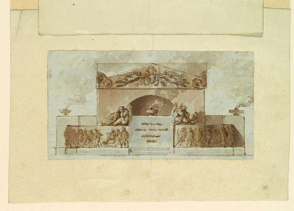 Drawing (Italy); pen and brown ink with blue, pink and brown wash and traces of graphite support: blue laid paper on secondary paper support; Museum purchase through gift of various donors and from Eleanor G. Hewitt Fund; 1938-88-6621