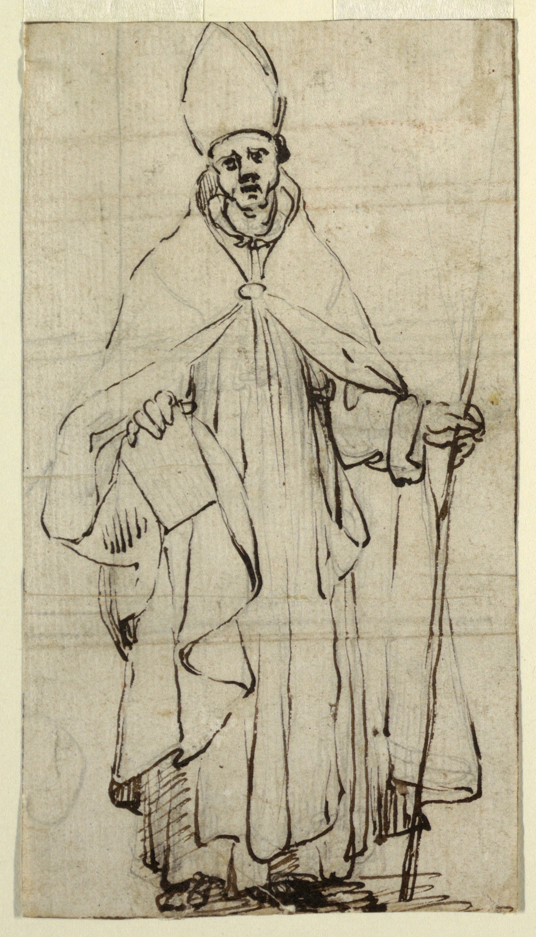 Drawing, Standing Bishop; Belisario Corenzio (Italian, active 1590–1646); Italy; pen and black-brown ink, graphite on cream laid paper; 18.8 x 10.8 cm (7 3/8 x 4 1/4 in.); Museum purchase through gift of various donors and from Eleanor G. Hewitt Fund; 1938-88-7083