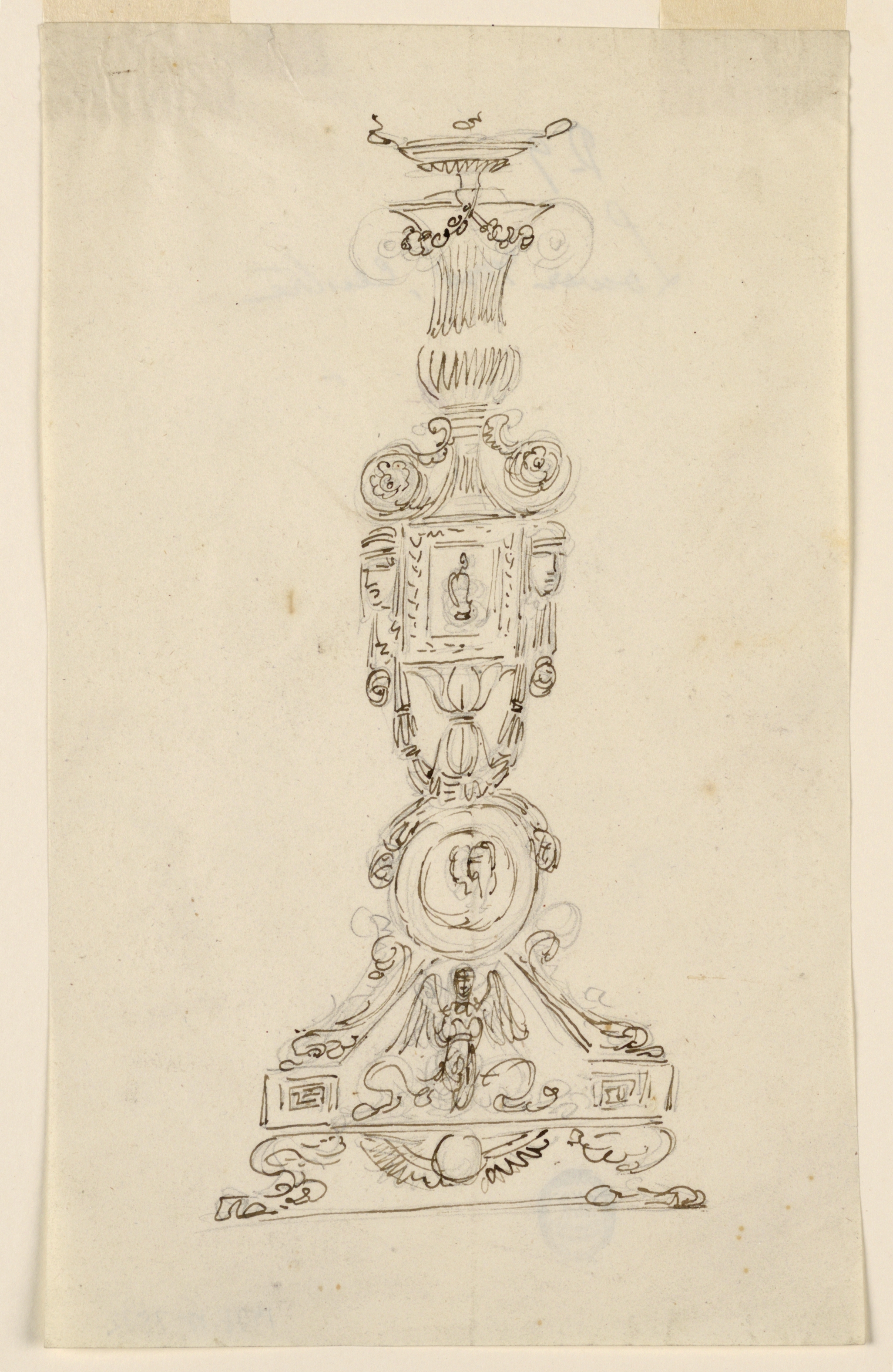 Drawing, Design for a Candelabrum; Giuseppe Bernardino Bison (Italian, 1762 - 1844); Italy; pen and sepia ink over graphite on wove paper.; 25.7 × 15.8 cm (10 1/8 × 6 1/4 in.); Museum purchase through gift of various donors and from Eleanor G. Hewitt Fund; 1938-88-7532