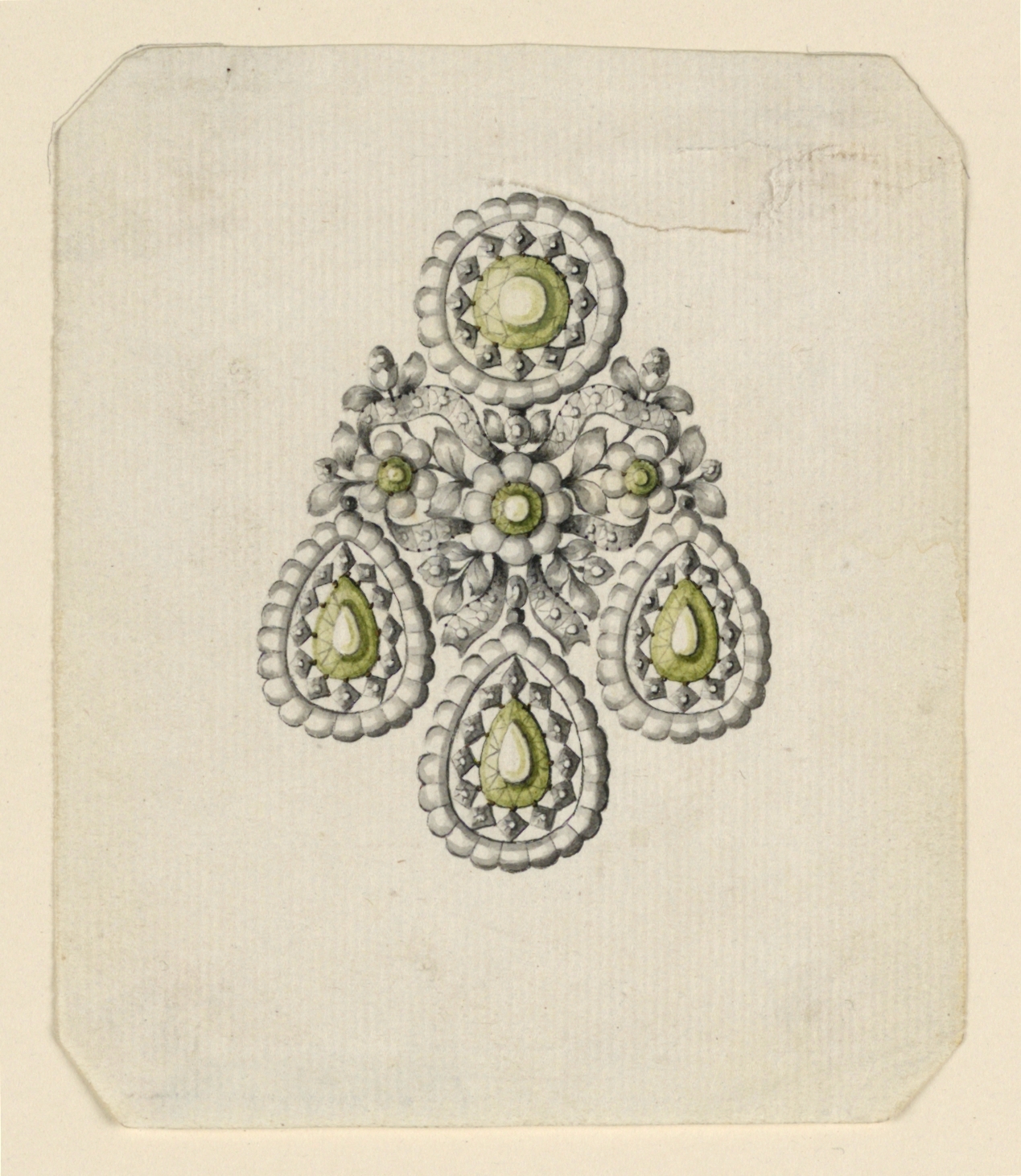 Drawing, Design for an Earring; Italy; pen and black ink, brush and green, gray watercolor on off-white laid paper; 11.4 × 9.5 cm (4 1/2 × 3 3/4 in.); Museum purchase through gift of various donors and from Eleanor G. Hewitt Fund; 1938-88-784