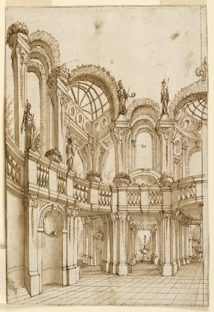 Drawing, Stage Design: Garden Architecture; Italy; pen and bistre, brush and sepia wash on paper; H x W: 22 × 32.8 cm (8 11/16 × 12 15/16 in.); Museum purchase through gift of various donors and from Eleanor G. Hewitt Fund; 1938-88-8
