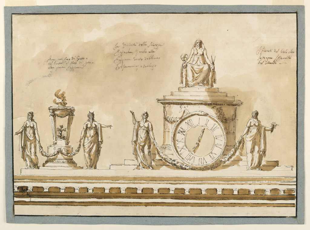 Drawing, Cresting of a timepiece; Architect: Giuseppe Barberi (Italian, 1746–1809); Italy; pen and brown ink, brush and brown wash, graphite; Image: 31 x 43.1 cm (12 3/16 x 16 15/16 in.); Museum purchase through gift of various donors and from Eleanor G. Hewitt Fund; 1938-88-8184