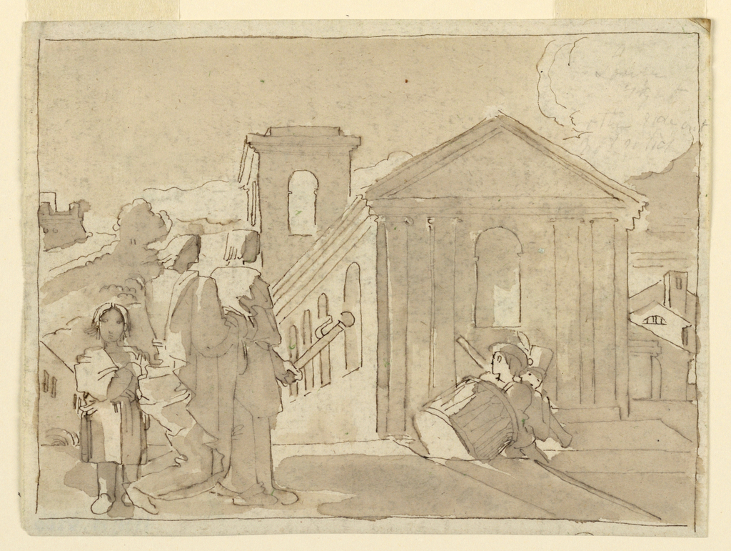 Drawing, Exterior with Classical Architecture and Figures with Musical Instruments