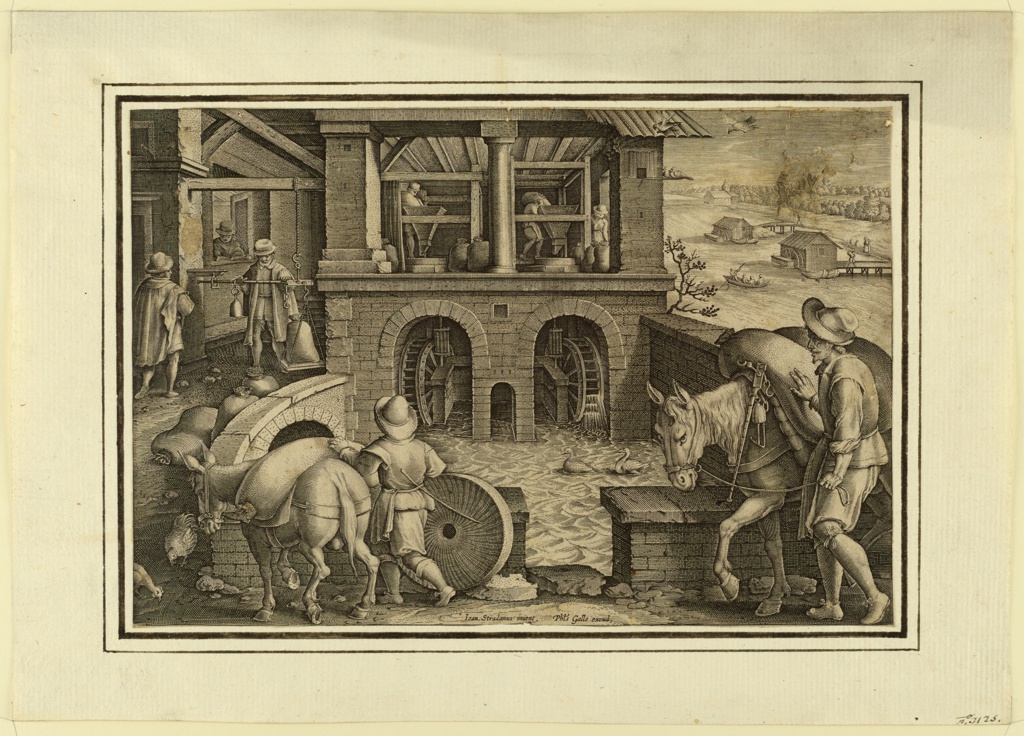 Print, A water mill; Designed by Jan van der Straet, called Stradanus (Flemish, 1523–1605); Engraved by Philips Galle (Flemish, 1537 - 1612), Hans Collaert II (Flemish, 1560 - 1628); Netherlands; engraving on paper; 18.5 × 27.2 cm (7 5/16 × 10 11/16 in.); Museum purchase through gift of various donors and from Eleanor G. Hewitt Fund; 1938-88-8431