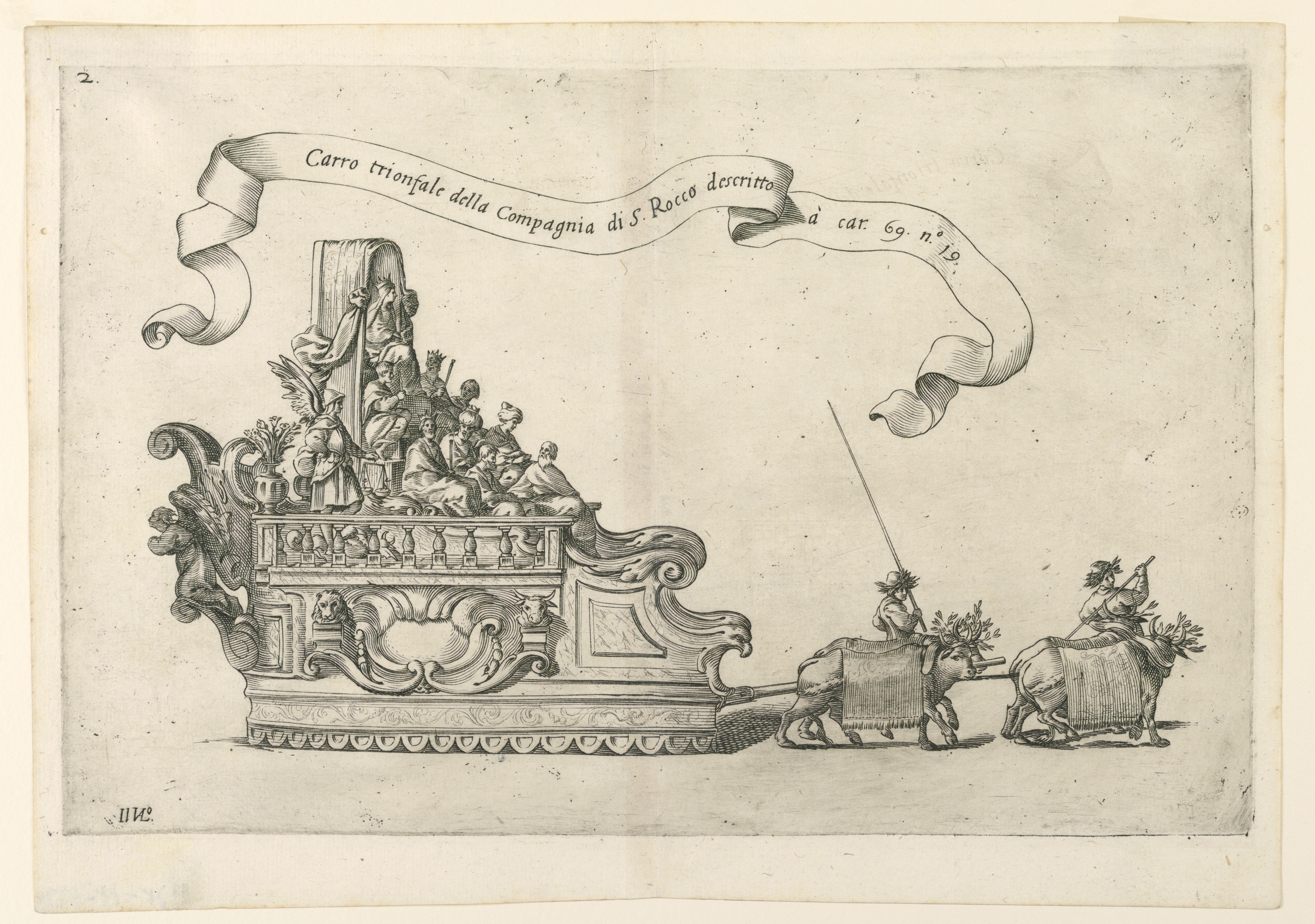 Print, A parade float in Reggio, Italy: "Carro trionfale della Compagnia di S. Rocco" (The Triumphal Carriage of the Company of St. Roch). Plate 2b from A. Isacchi, "Relatione di Alfonso Isachi intorno l'origine, solennità, traslatione, et miracoli della Madonna di Reggio [...]" published by Flaminio Bartoli, Reggio.