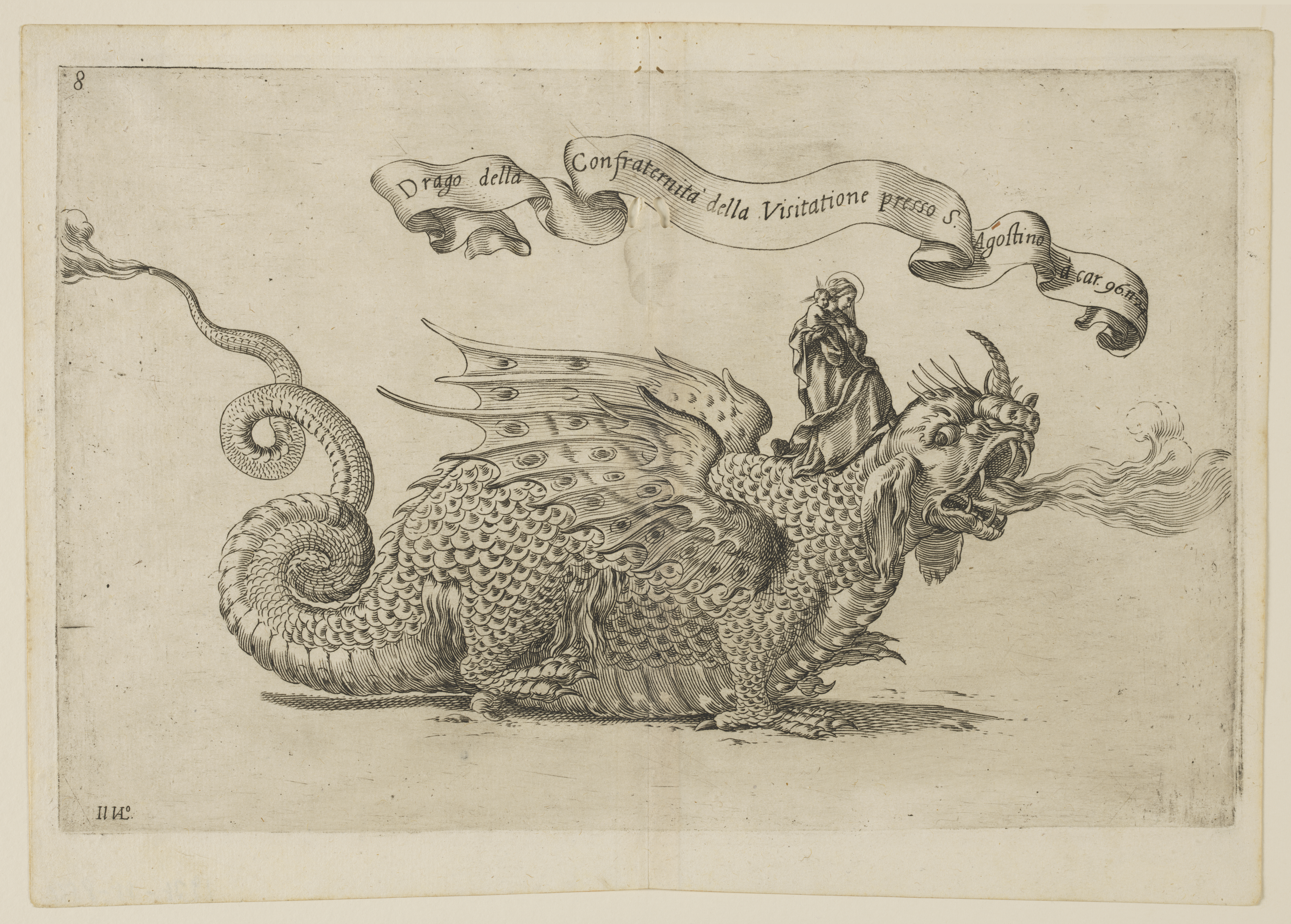 Print, Parade Float with the Virgin and Child riding a Dragon, plate 8 from A. Isacchi, "Relatione di Alfonso Isachi intorno l'origine, solennità, traslatione, et miracoli della Madonna di Reggio [...]," (Account by Alfonso Isachi regarding the Origin, Festivities, Procession, and Miracles of the Madonna of Reggio)