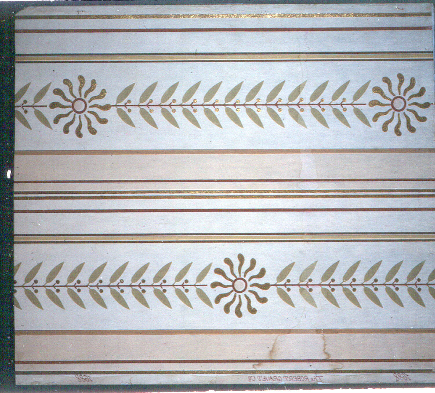 This is a frieze. It was manufactured by Robert Graves Co.. It is dated 1890–1900 and we acquired it in 1939. Its medium is machine-printed paper, mica. It is a part of the Wallcoverings department.