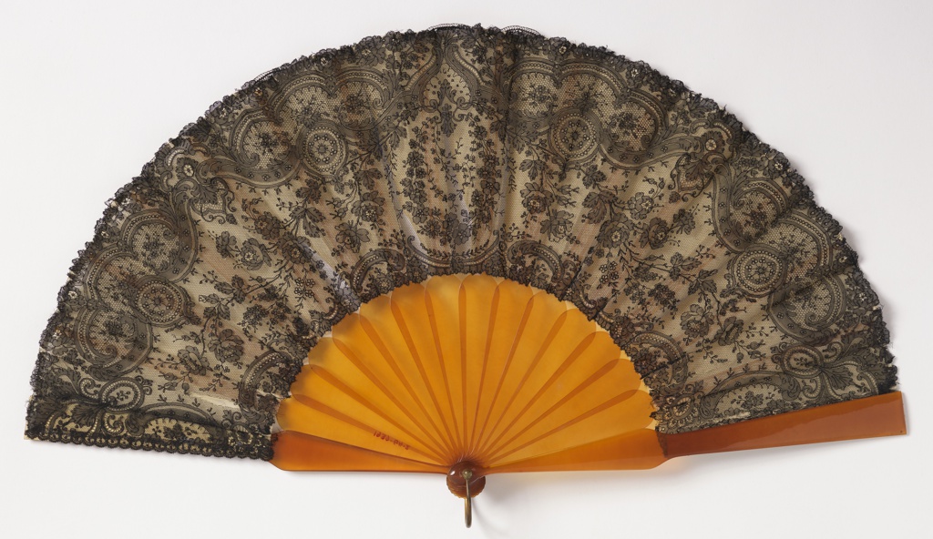 This is a Pleated fan. It is dated 19th century and we acquired it in 1939. Its medium is silk bobbin lace leaf backed with linen, celluloid sticks. It is a part of the Textiles department.