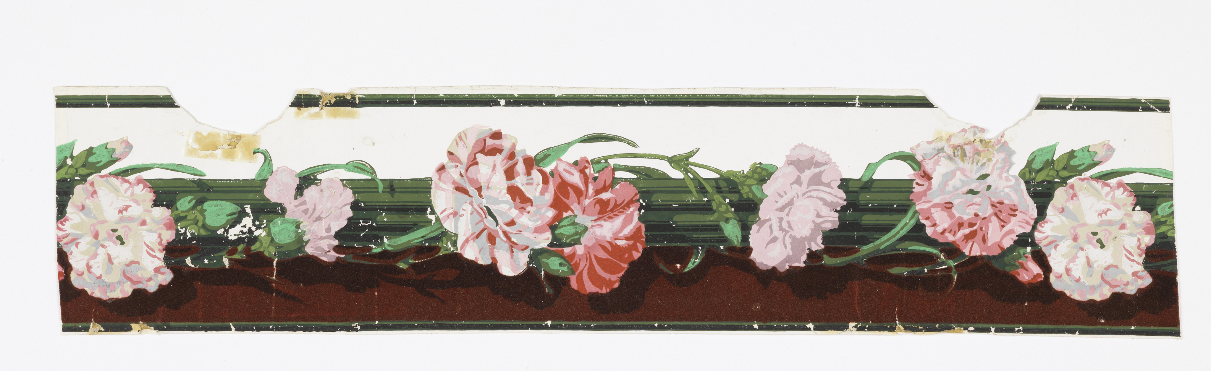This is a Border. It is dated 1850–60 and we acquired it in 1940. Its medium is block-printed and flocked. It is a part of the Wallcoverings department.