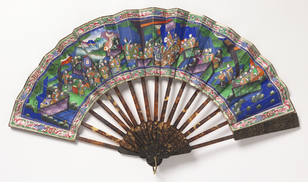 This is a Pleated fan. It is dated 1850–1900 and we acquired it in 1940. Its medium is gilded silk leaf painted with tempera, carved tortoise shell sticks, silk tassel. It is a part of the Textiles department.