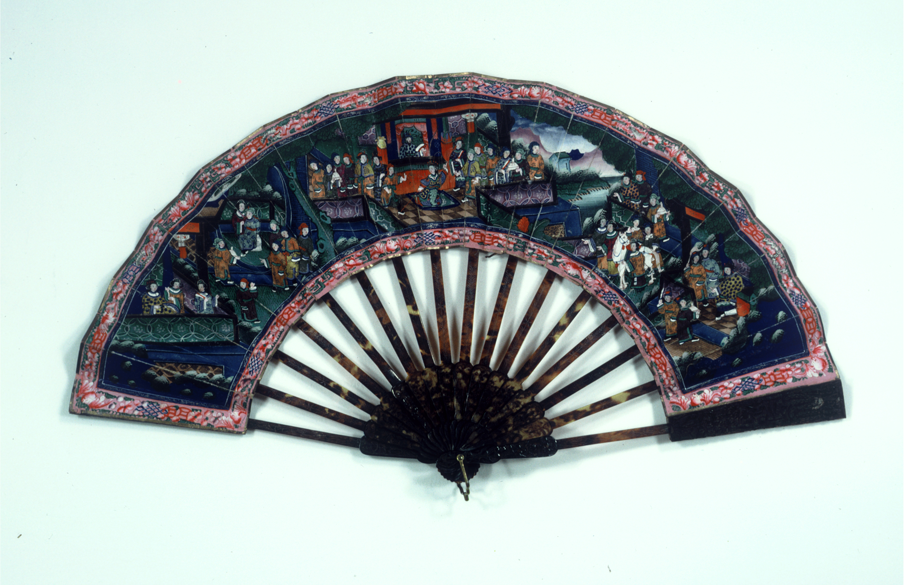 This is a Pleated fan. It is dated 1850–1900 and we acquired it in 1940. Its medium is gilded silk leaf painted with tempera, carved tortoise shell sticks, silk tassel. It is a part of the Textiles department.