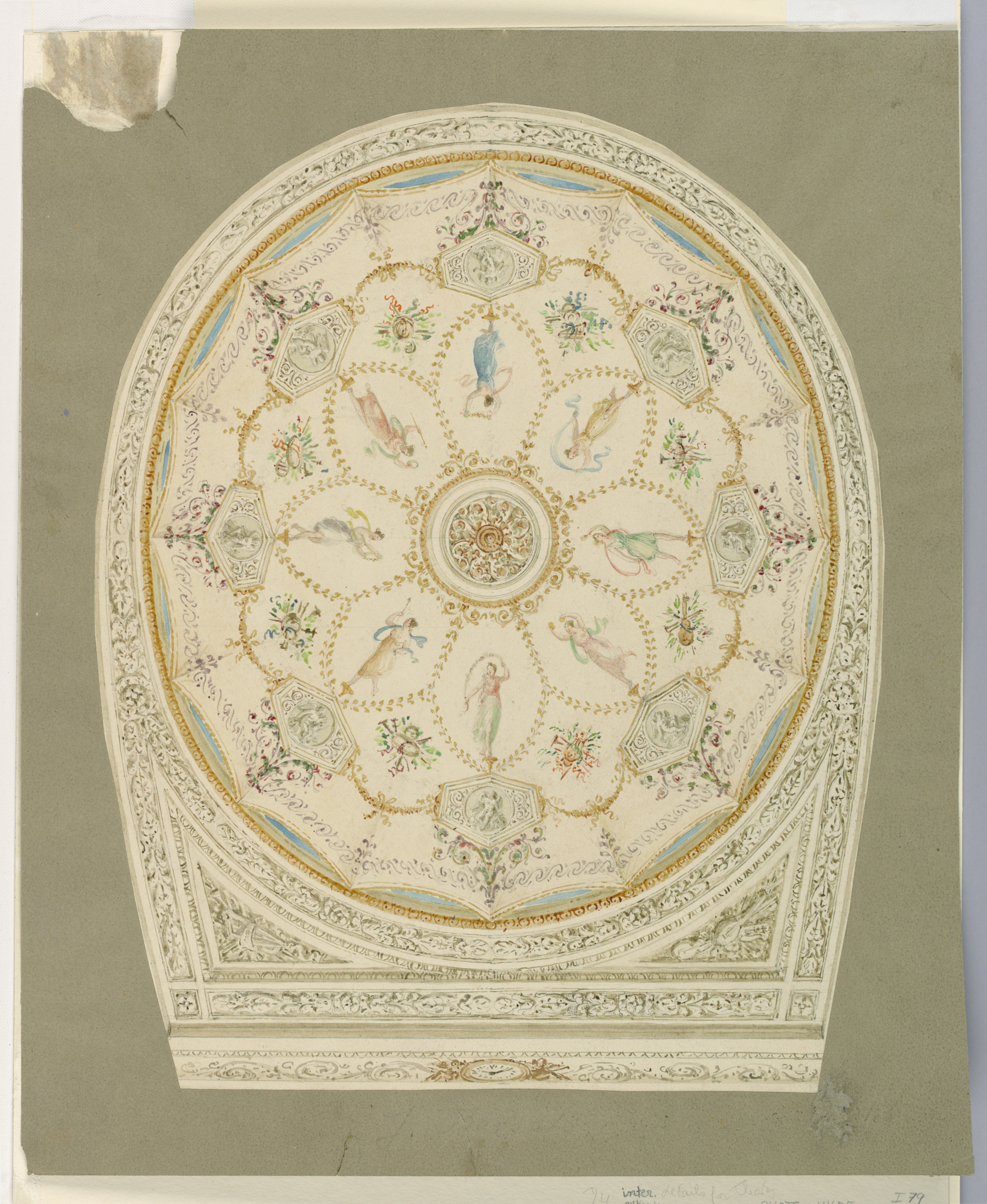 Drawing, Design for a Theater Ceiling; Designed by Giuseppe Borsato (Italian, 1770 - 1840); Italy; pen and gray-brown ink, brush and watercolor, gold paint, graphite on paper; 35.7 × 28.7 cm (14 1/16 × 11 5/16 in.); Museum purchase from the Mary Hearn Greims Fund; 1940-21-22