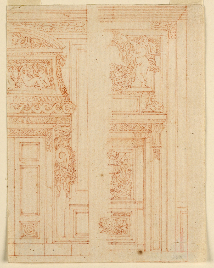 Drawing, Elevations of a Door, Door Frames, Overdoor, and Adjoining Wall Panel; Designed by Mauro Antonio Tesi (Italian, 1730 - 1766); Italy; red chalk on paper; 23 × 17.6 cm (9 1/16 × 6 15/16 in.); Museum purchase from the Mary Hearn Greims Fund; 1940-21-33