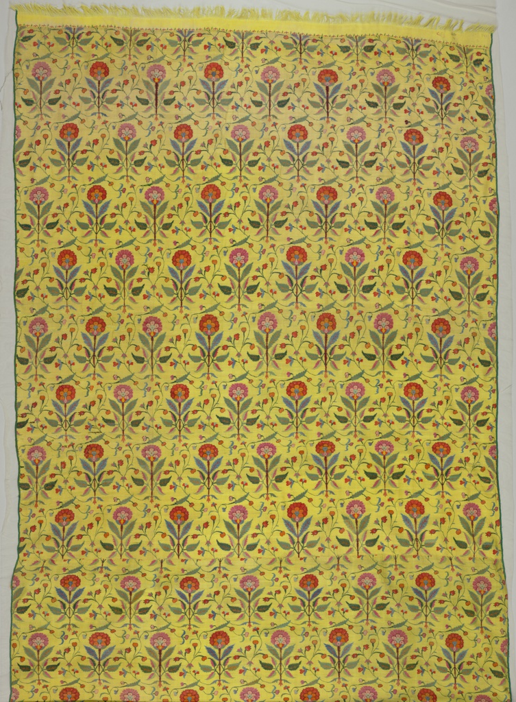 This is a Shawl. It is dated 18th century and we acquired it in 1940. Its medium is wool and its technique is tapestry weave. It is a part of the Textiles department.
