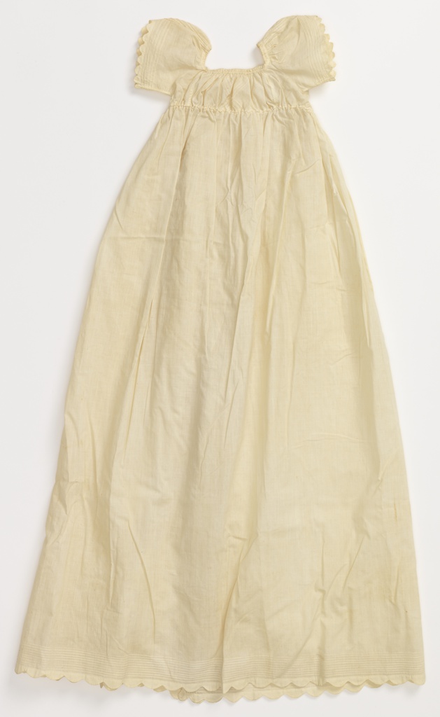 This is a Christening gown. It is dated 19th century and we acquired it in 1940. Its medium is cotton and its technique is embroidered on plain weave. It is a part of the Textiles department.