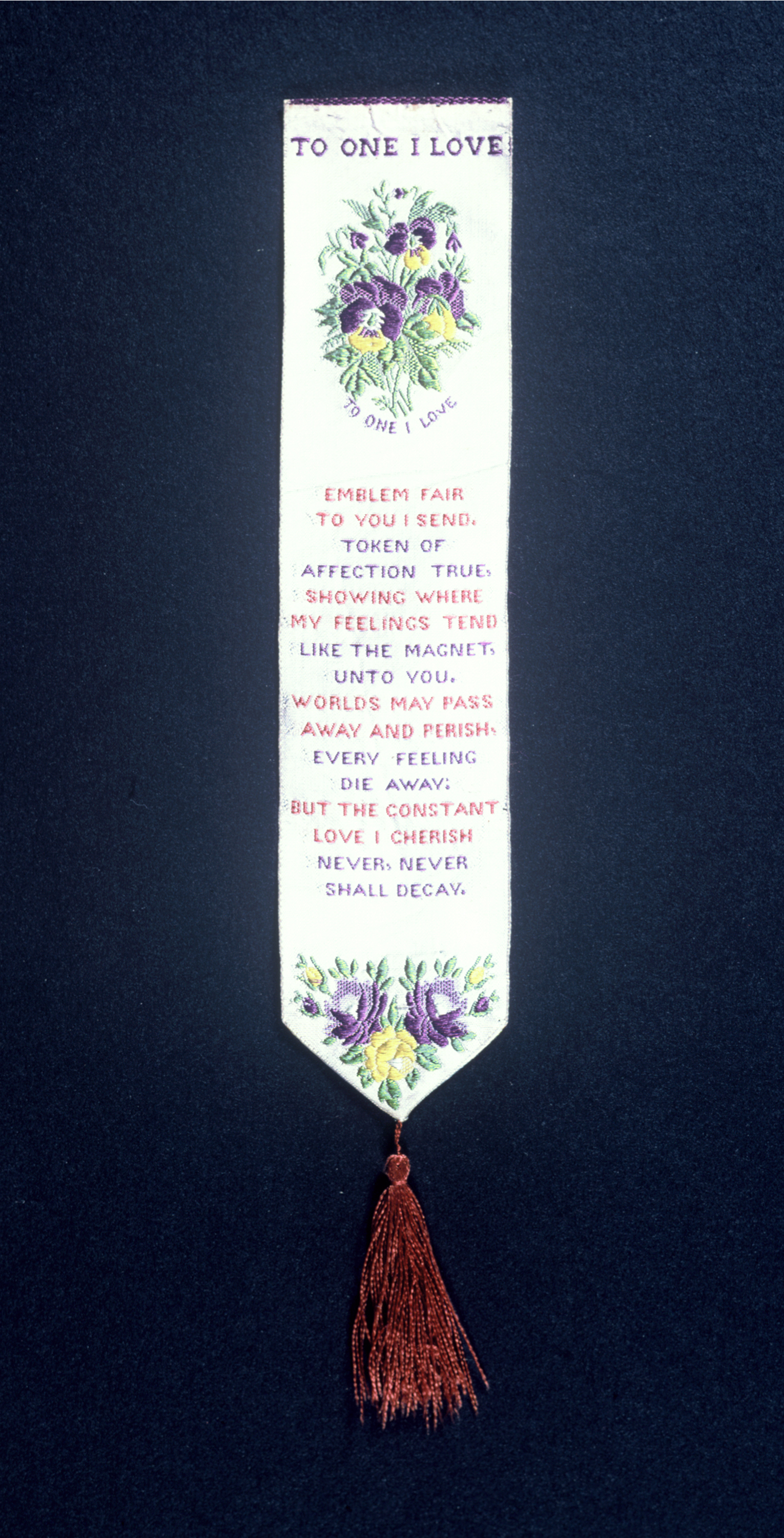 Bookmark, To One I Love; Manufactured by Thomas Stevens (English, 1828–1888); England; silk; H x W: 18 × 3.1 cm (7 1/16 × 1 1/4 in.); 1941-11-4