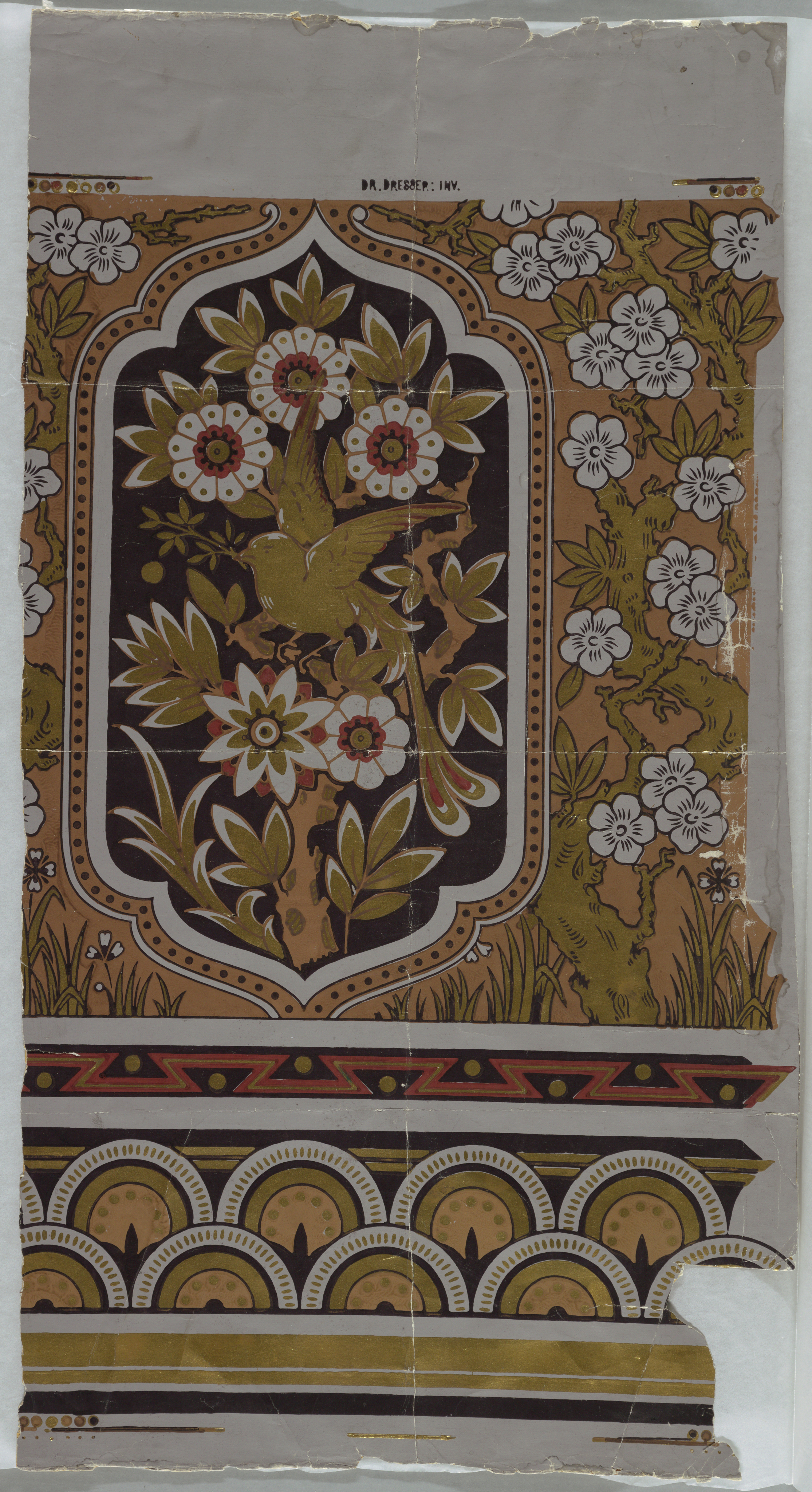 This is a Dado. It was designed by Christopher Dresser. It is dated 1880 and we acquired it in 1941. Its medium is block-printed paper. It is a part of the Wallcoverings department.