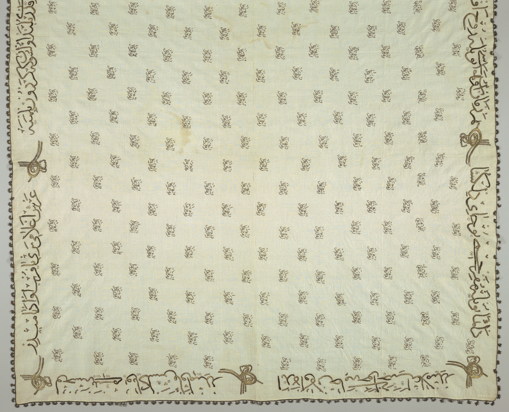 This is a Veil. We acquired it in 1941. Its technique is satin and double running embroidery stitches on plain weave. It is a part of the Textiles department.