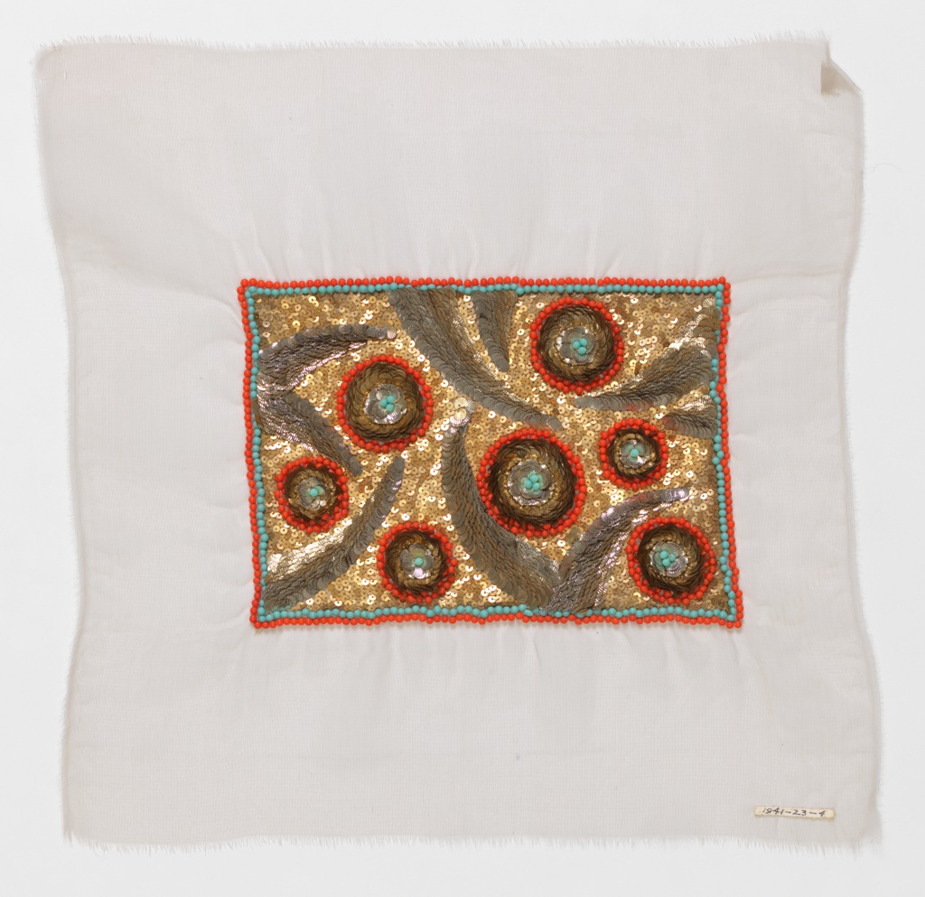 This is a Embroidery sample. It was made by S.L. Klein, Inc. (New York, NY, USA). It is dated 1940 and we acquired it in 1941. Its medium is silk net, glass beads in blue and coral spangles. It is a part of the Textiles department.