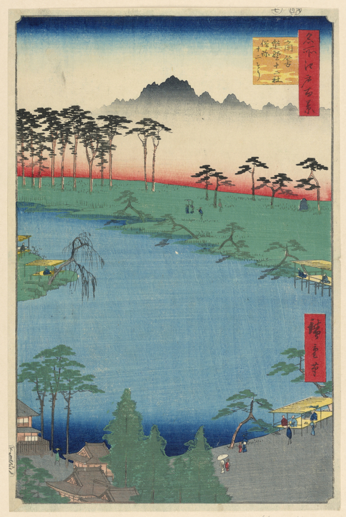 Print, Kumano Junisha Shrine at Tsunohazu from One Hundred Famous Views of Edo; Ando Hiroshige (Japanese, 1797 - 1858); Japan; woodblock print in colored ink on paper; Gift of the Estate of Mrs. Robert H. Patterson; 1941-31-265