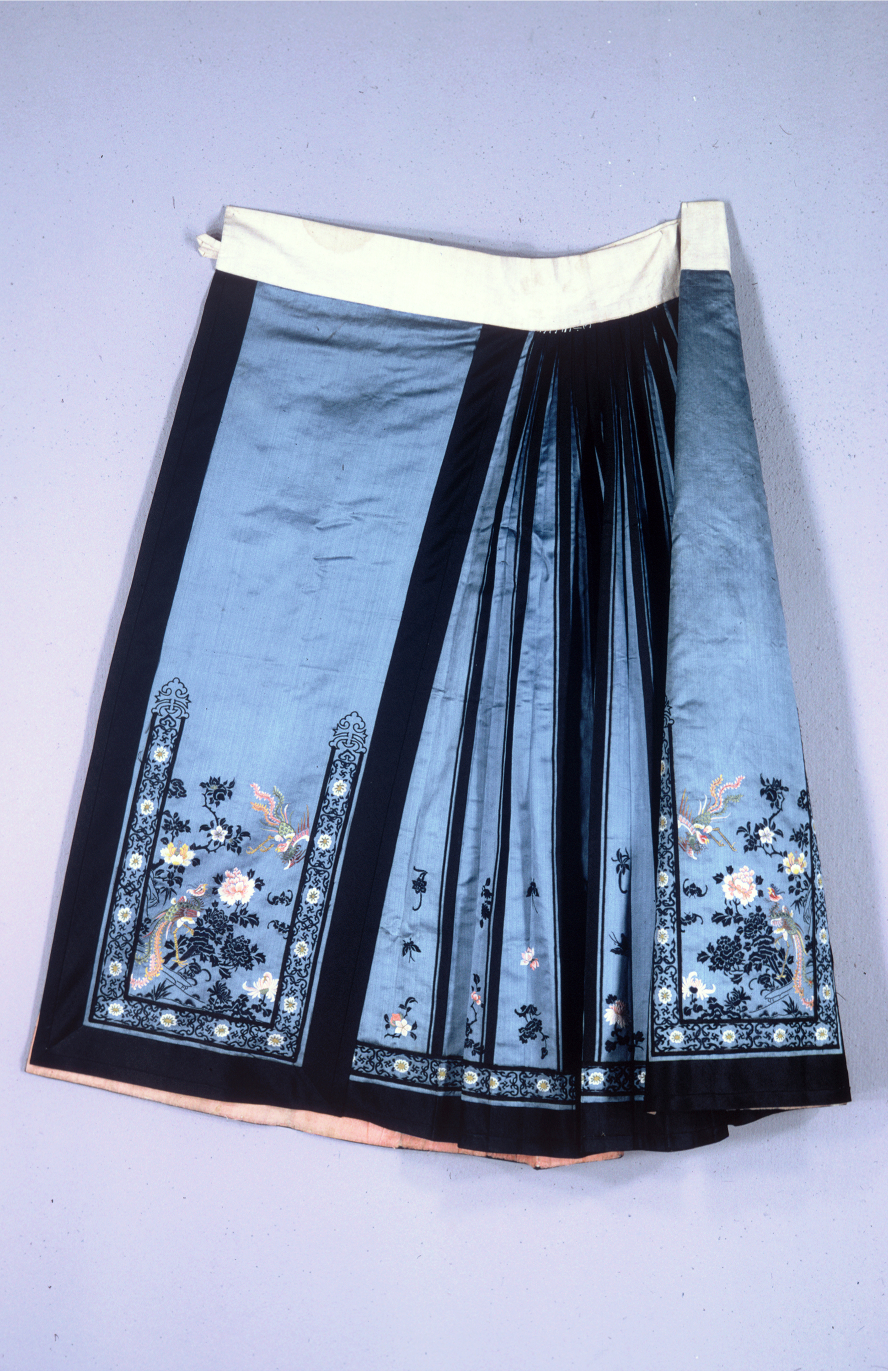 Chinese skirt styles are often called aprons and are typically comprised of two identical sections, each with a decorated panel, a side panel and a pleated or gored panel. They were worn overlapping, wrapped around the body and secured through fabric loops and knotted buttons. The sections were attached to a wide waistband, usually made of cotton or hemp so that the silken fabric of the skirt would not slip down. Only Han women wore skirts, not the Manchu women of the ruling Qing dynasty, and they were worn on formal occasions together with trousers and jackets. This explains why the panels were only embroidered to where the jacket meets the skirt.