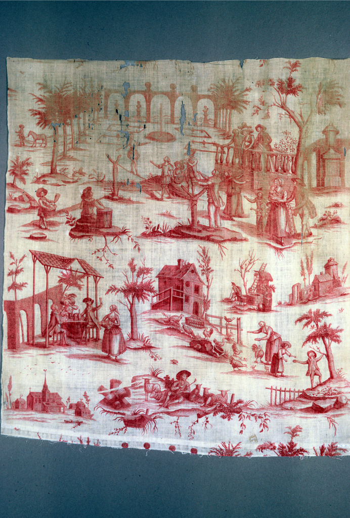 This is a Textile. It was manufactured by Petitpierre et Cie. It is dated ca. 1785 and we acquired it in 1941. Its medium is cotton and its technique is printed by engraved copper plate on plain weave; printed in red. It is a part of the Textiles department.