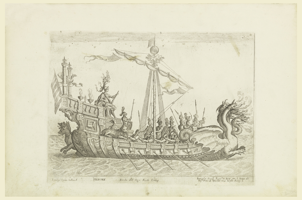 Print, Hercole barca del Sig. Nicolo Cimenes, from Vessels of the Argonauts for the wedding celebration of Cosimo de' Medici in 1608, plate 19; Etched by Remigio Cantagallina (Italian, ca. 1582–1656); After Giulio Parigi (Italian, 1571–1635); Patron: Medici Family, Cosimo II de' Medici (Italian, 1590 – 1621); Italy; etching on laid paper; 26.9 x 40.6 cm (10 9/16 in. x 16 in.) Platemark: 20.8 x 28.3 cm (8 3/16 x 11 1/8 in.); Gift of Mrs. William Greenough; 1941-49-40
