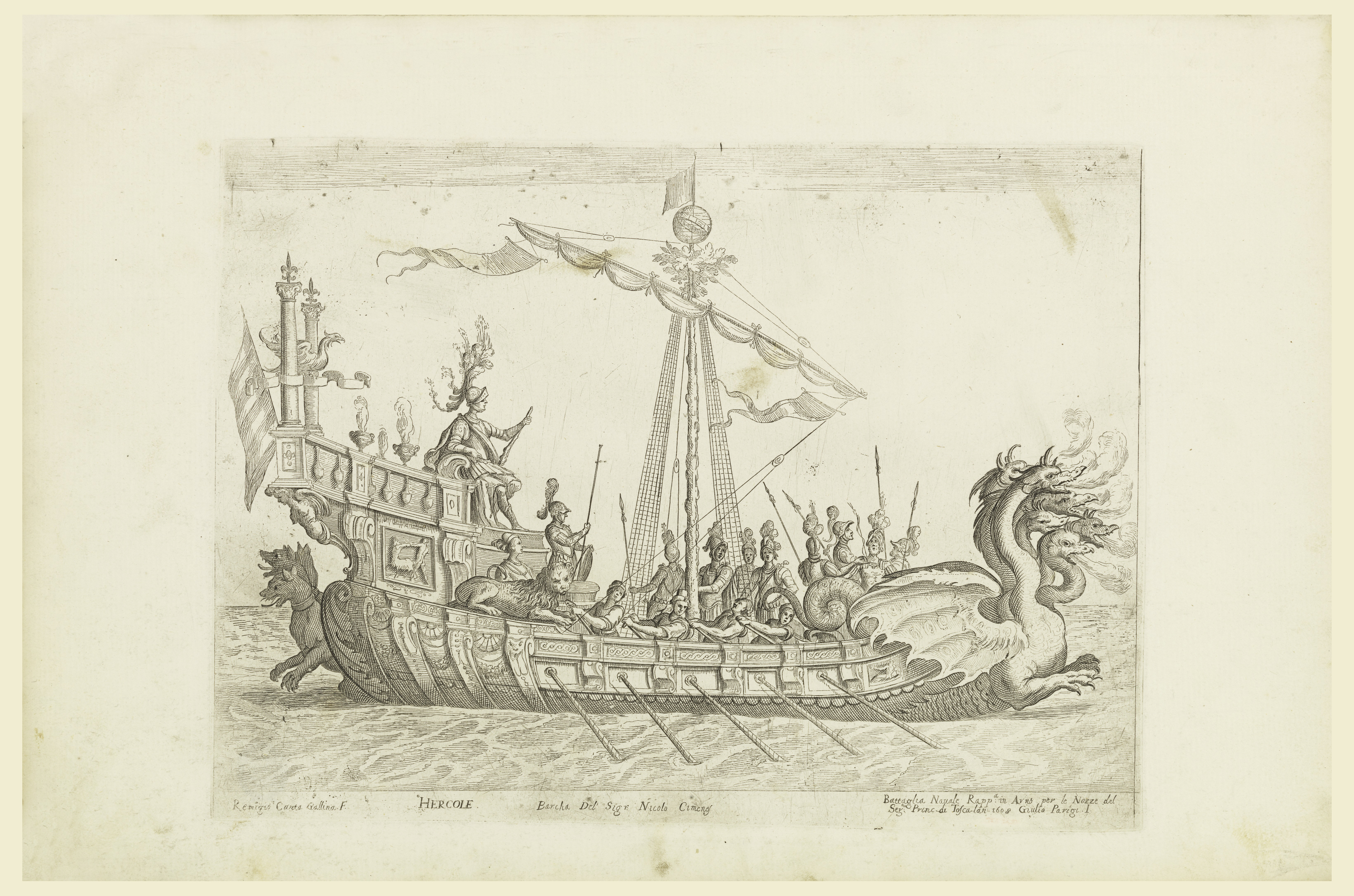 Print, Hercole barca del Sig. Nicolo Cimenes, from Vessels of the Argonauts for the wedding celebration of Cosimo de' Medici in 1608, plate 19