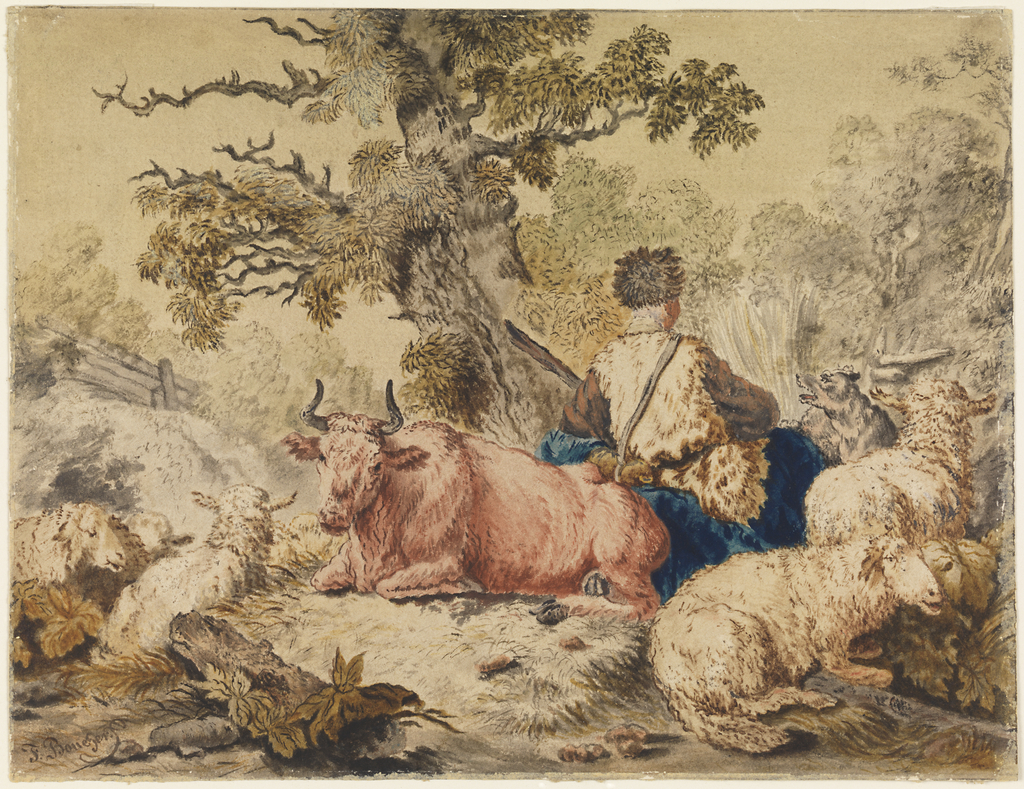 Drawing, Seated Shepherd; After François Boucher (French, 1703–1770); Made by Jean-Baptiste Marie Huet (French, 1745 - 1811); France; brush and water colors, pen and black ink on paper; 17 x 22 cm (6 11/16 x 8 11/16 in.); Gift of Mrs. William Greenough; 1941-49-64