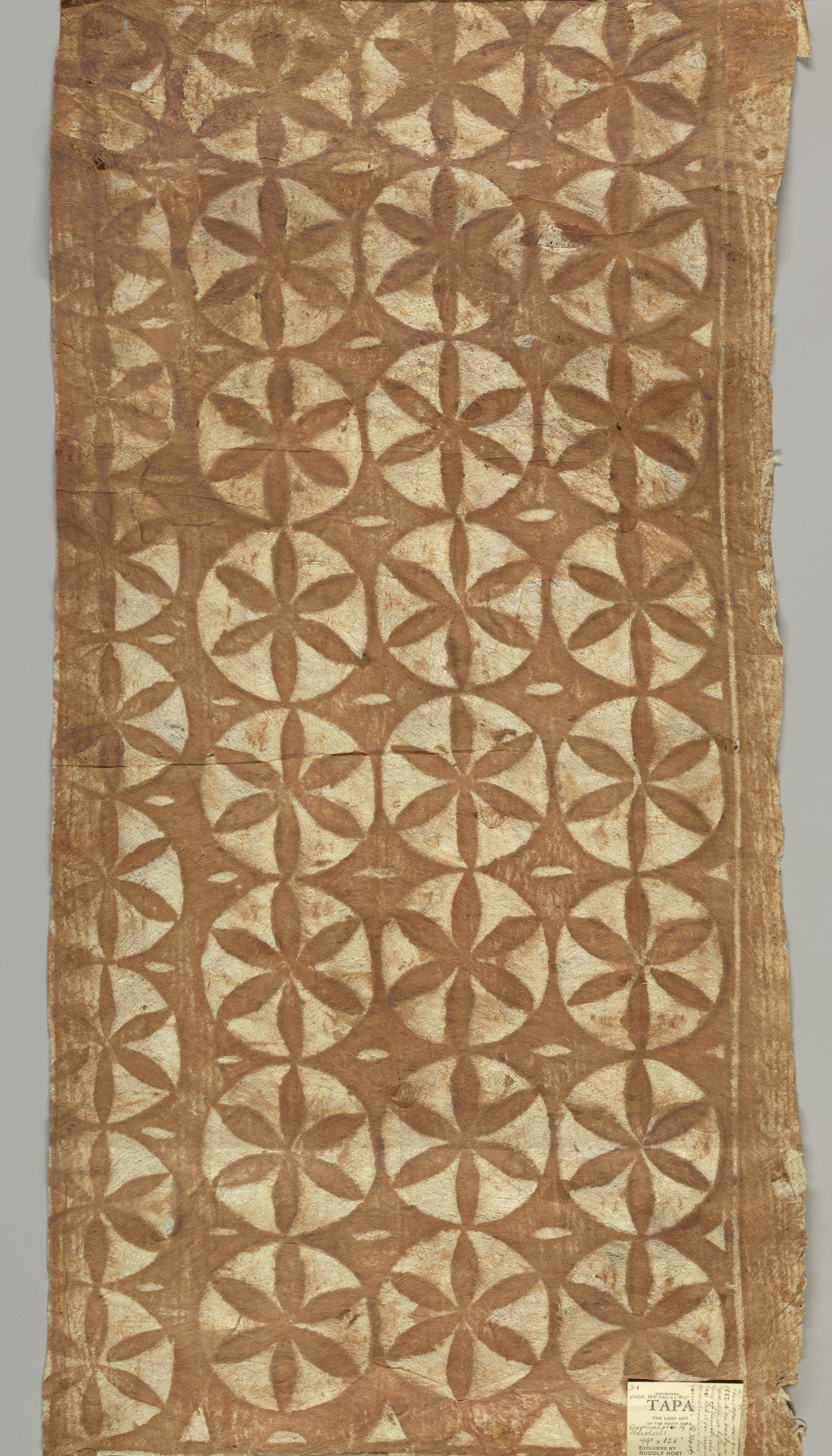 This is a Tapa cloth. It is dated 1800–1850 and we acquired it in 1941. Its medium is mulberry tree bark (broussonetia papyrifera); tapa and its technique is beaten, printed and painted. It is a part of the Textiles department.
