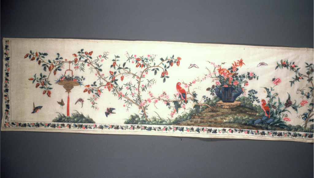 This is a panel. It is dated 18th century and we acquired it in 1941. Its medium is silk; pineapple fiber; tempera and its technique is painted on fancy gauze. It is a part of the Textiles department.