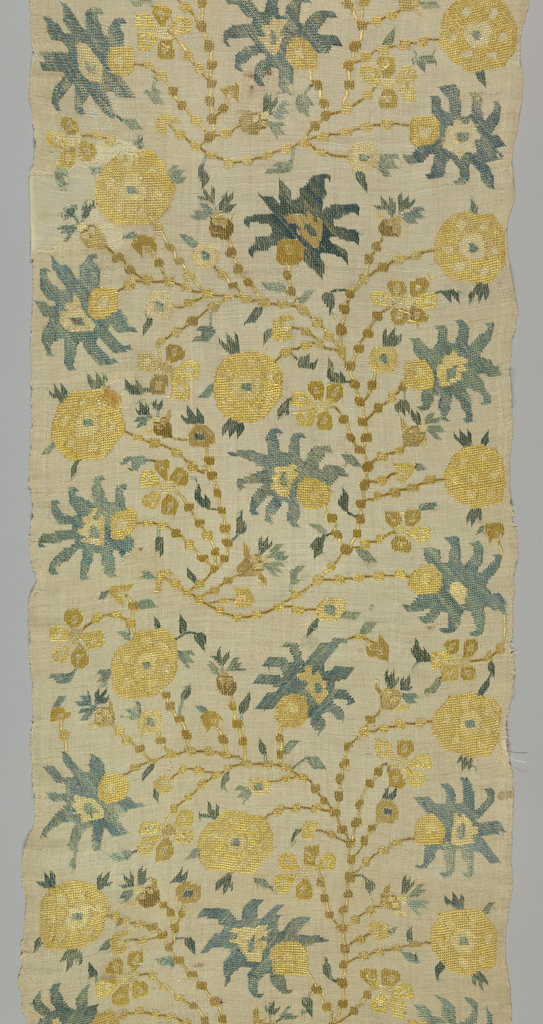 This is a Fragment. We acquired it in 1942. Its medium is embroidery. It is a part of the Textiles department.