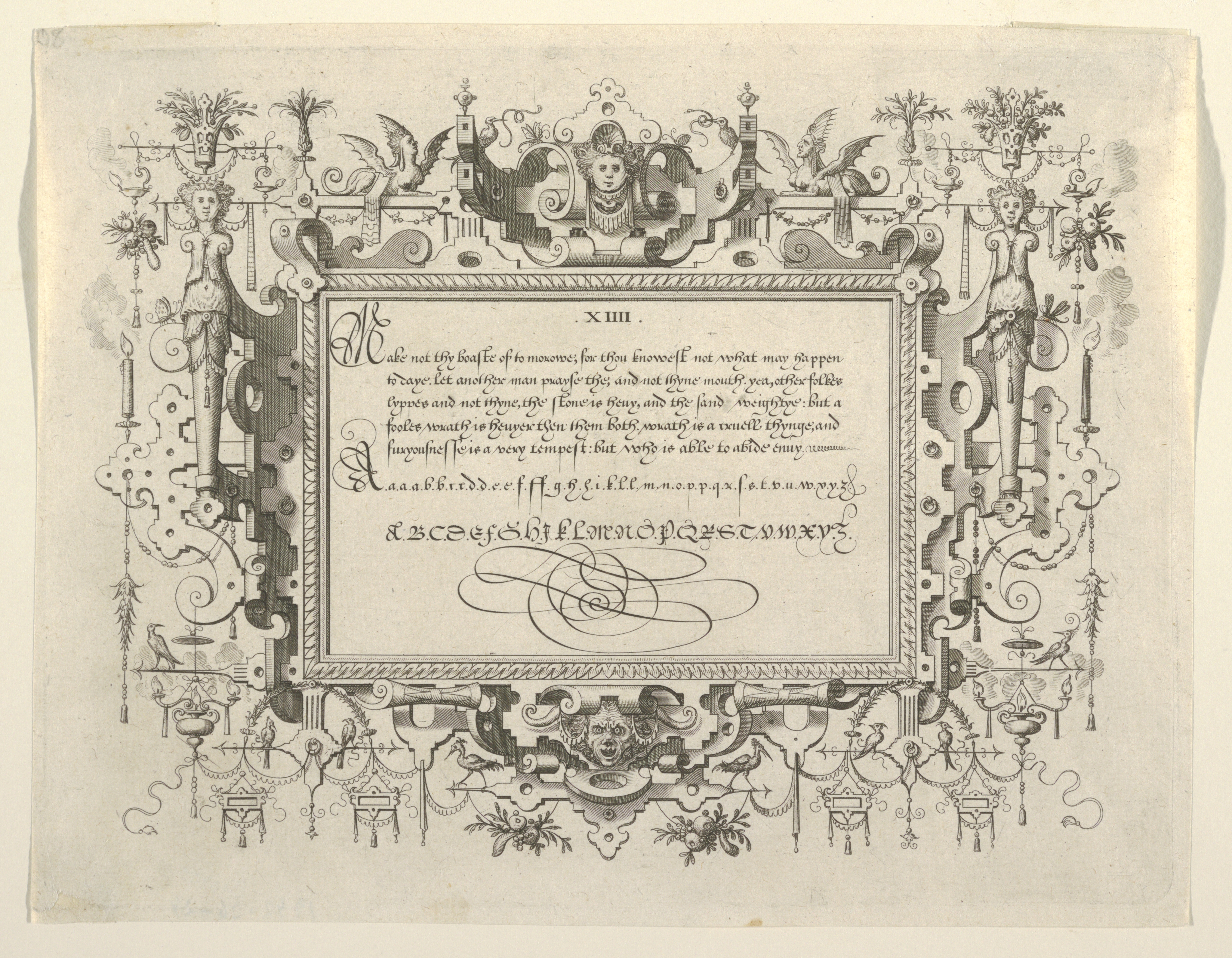 Print, Plate XIV, from the "Exercitatio Alphabetica"; Designed by Clément Perret (1569/71–?), Hans Vredeman de Vries (Dutch, 1527 - ca. 1606); Engraved by Cornelis de Hooghe (?–1583), ATA; Netherlands; engraving on white laid paper; 22.5 x 28.9 cm (8 7/8 x 11 3/8 in.); Museum purchase through gift of Mrs. John Innes Kane; 1942-36-24
