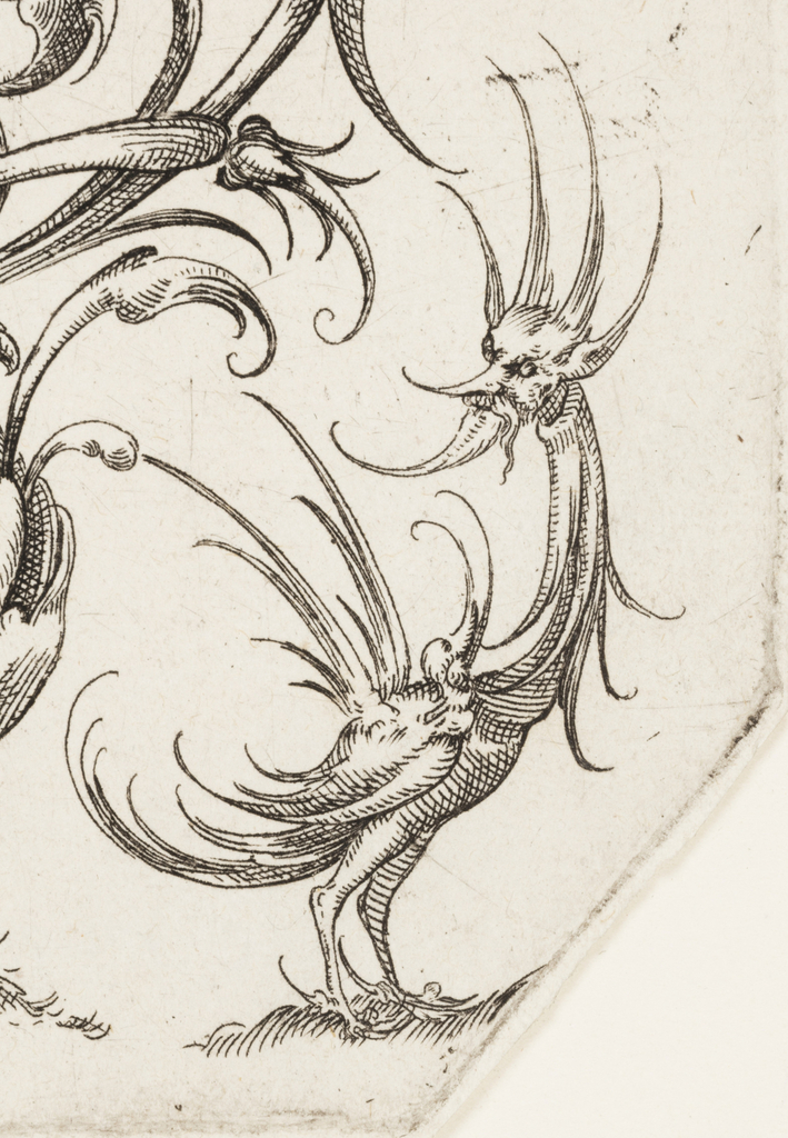 This delicate series of prints was one of several created by Dietterlin the Younger in the years after the publication of Christoph Jamnitzer’s Neüw Grotteßken Buch in 1610. The late Gothic designs for bouquets were likely intended as patterns for metalwork or jewelry and feature spaces for gems and pearls. Dietterlin’s slender, ethereal creations take the grotesque to its most fragile state—vegetal forms turn monstrous as they terminate, and freestanding figures are at once charming and terrifying.