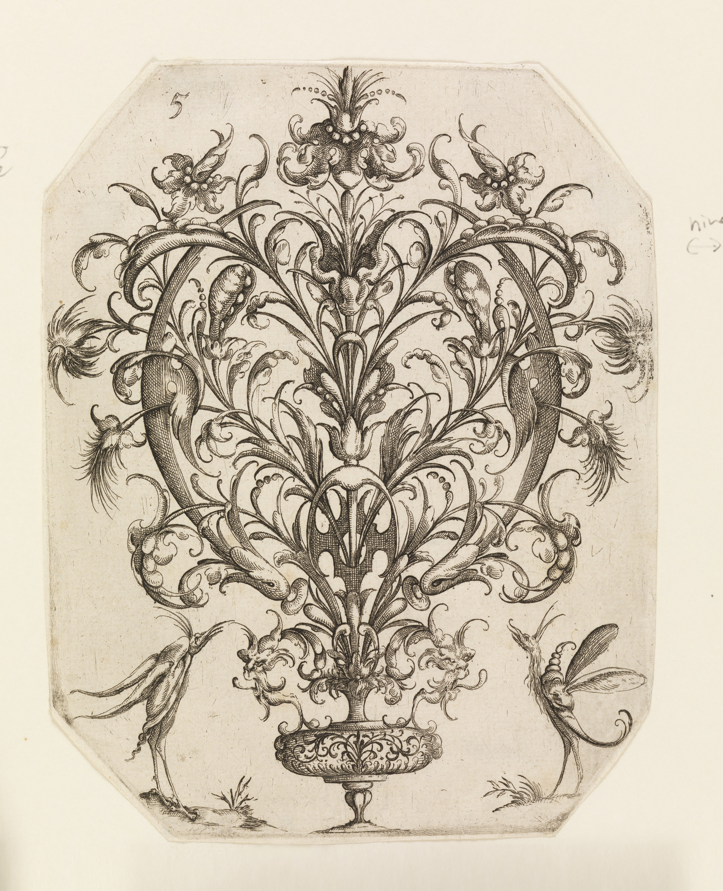 This delicate series of prints was one of several created by Dietterlin the Younger in the years after the publication of Christoph Jamnitzer’s Neüw Grotteßken Buch in 1610. The late Gothic designs for bouquets were likely intended as patterns for metalwork or jewelry and feature spaces for gems and pearls. Dietterlin’s slender, ethereal creations take the grotesque to its most fragile state—vegetal forms turn monstrous as they terminate, and freestanding figures are at once charming and terrifying.