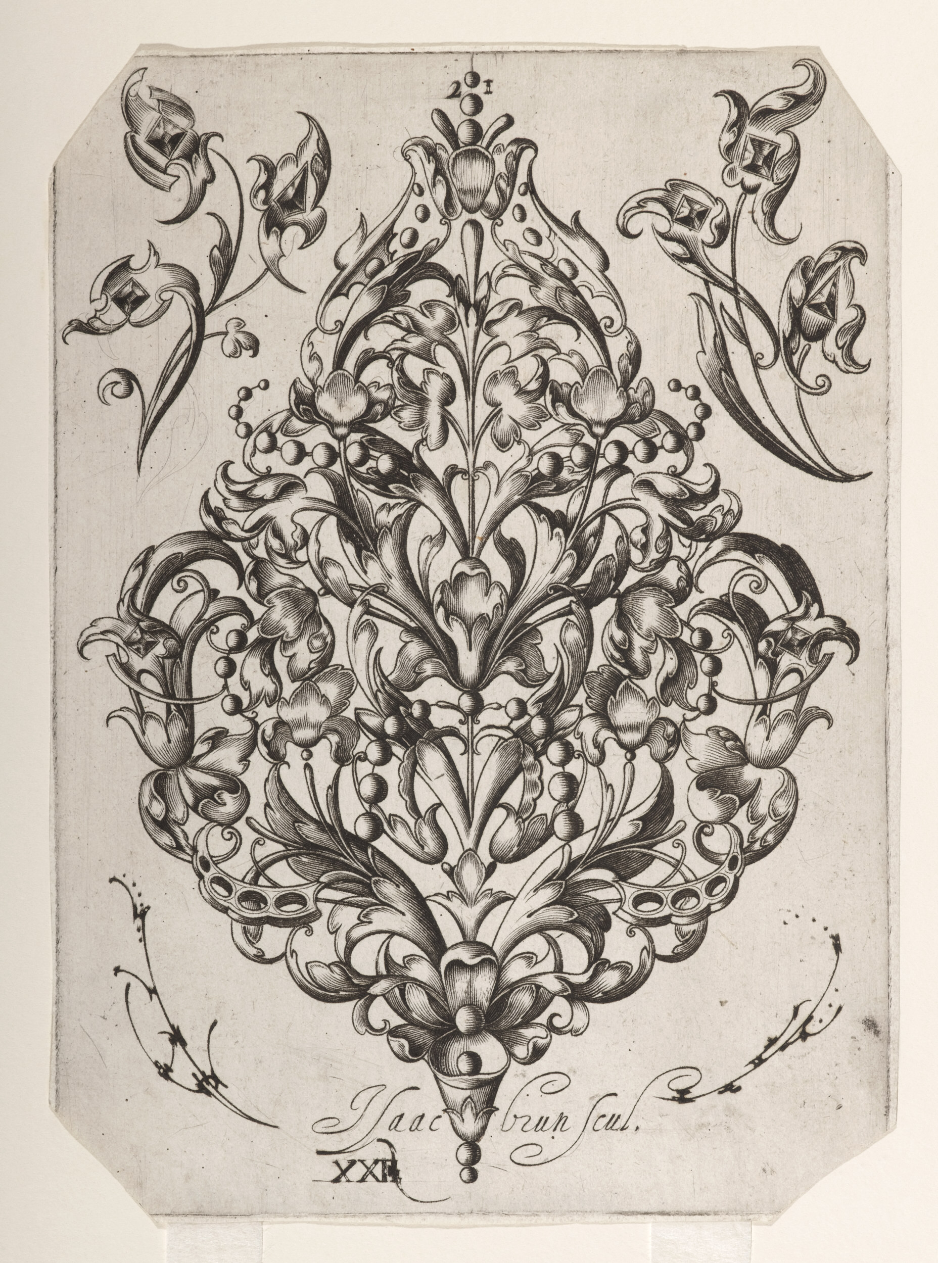 Print, Design for a Pendant, plate XXI, from the series Tabulae Gemmiferae XXIV; Designed by Peter Symony (Swiss, active 1603–1621); Engraved by Isaac Brun (German, ca. 1590–after 1657); Germany; engraving on white laid paper; Sheet: 16.5 x 12 cm (6 1/2 x 4 3/4 in.) Platemark: 16.3 x 11.7 cm (6 7/16 x 4 5/8 in.); Museum purchase through gift of Mrs. John Innes Kane; 1942-36-30