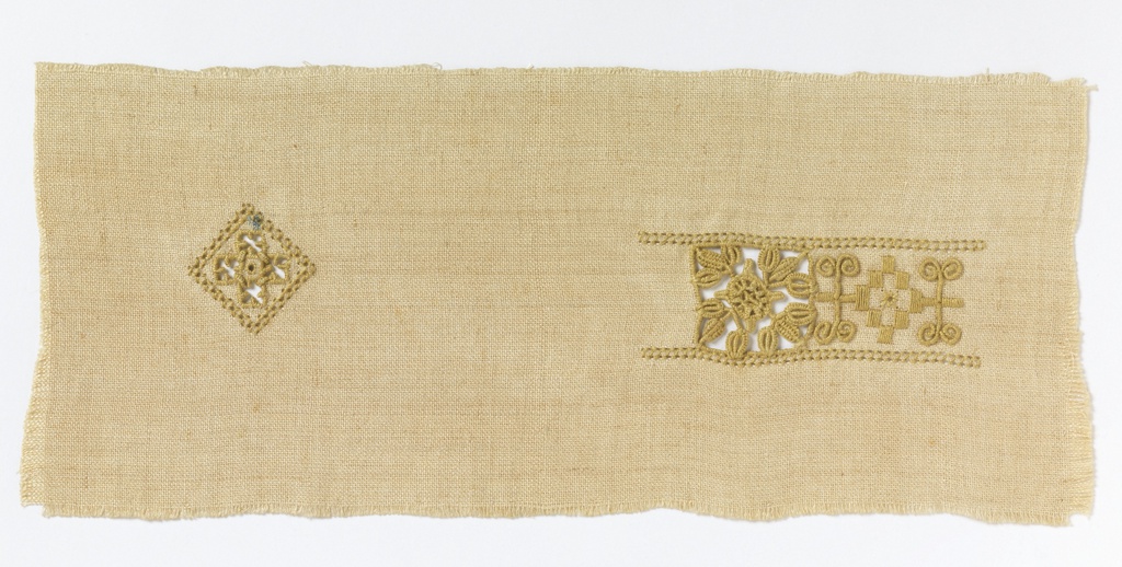 This is a Unfinished work. It was made by Scuola d'Industrie Italiane. It is dated early 20th century and we acquired it in 1942. Its medium is linen, mercerized cotton and its technique is cutwork and overcasting, satin, eyelet, hem and buttonhole embroidery stitches on plain weave. It is a part of the Textiles department.