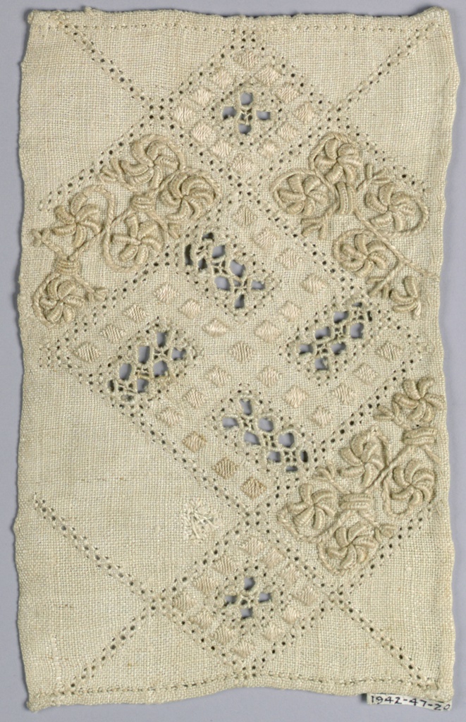 This is a Sampler. It was made by Scuola d'Industrie Italiane. It is dated early 20th century and we acquired it in 1942. Its medium is linen, mercerized cotton and its technique is cutwork with satin, hem, overcasting and buttonhole stitches. It is a part of the Textiles department.