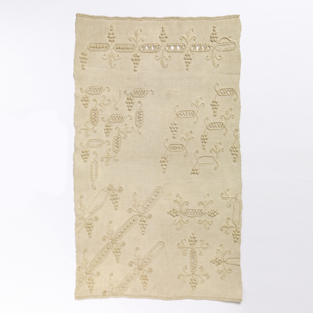 This is a Sampler. It was made by Scuola d'Industrie Italiane and embroidered by Miss Francesca Amari. It is dated early 20th century and we acquired it in 1942. Its medium is linen and its technique is grape, satin, hem, overcast, and buttonhole stitches on plain weave. It is a part of the Textiles department.